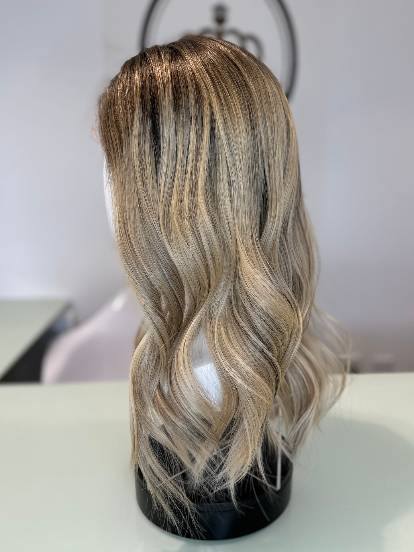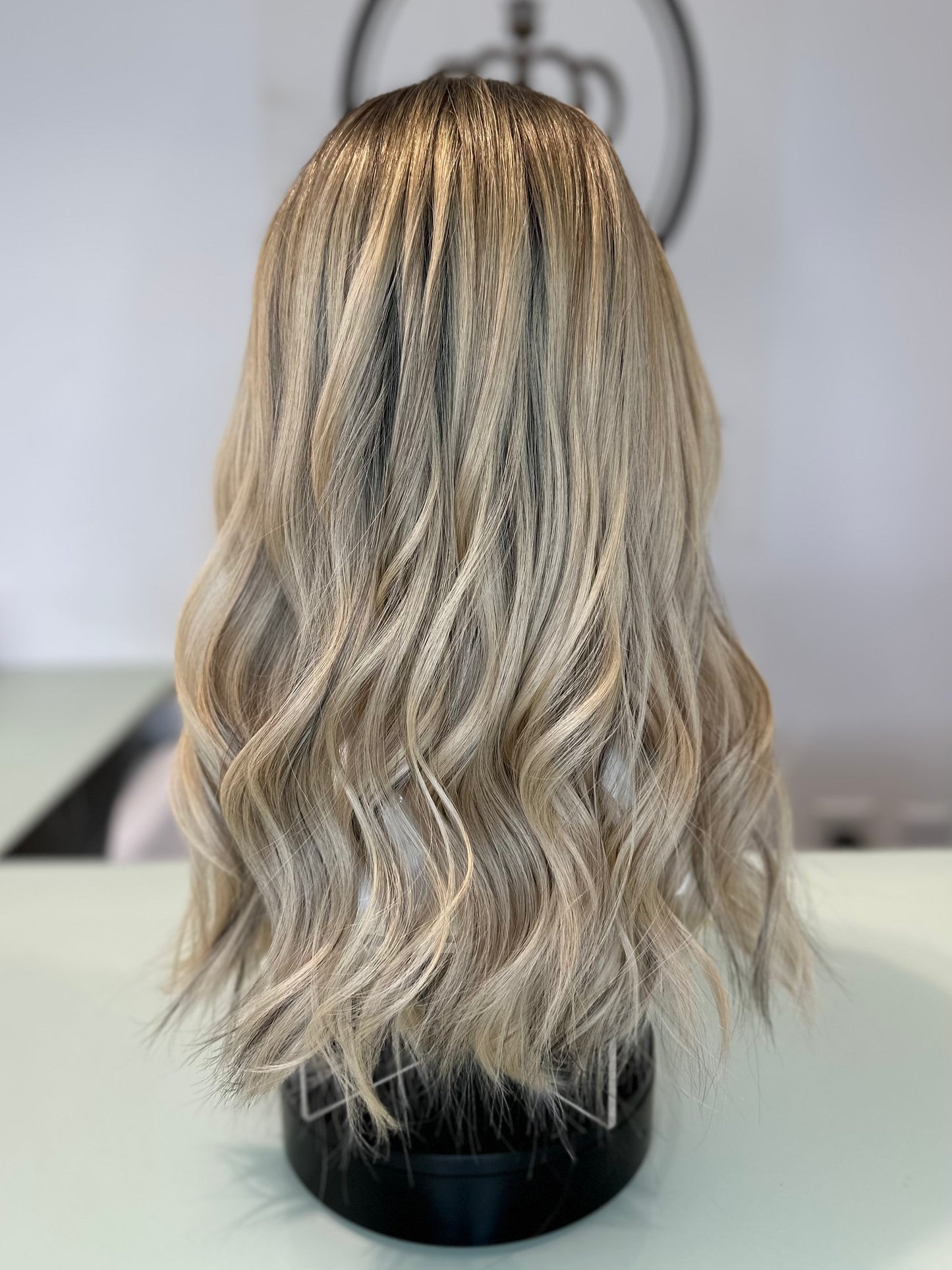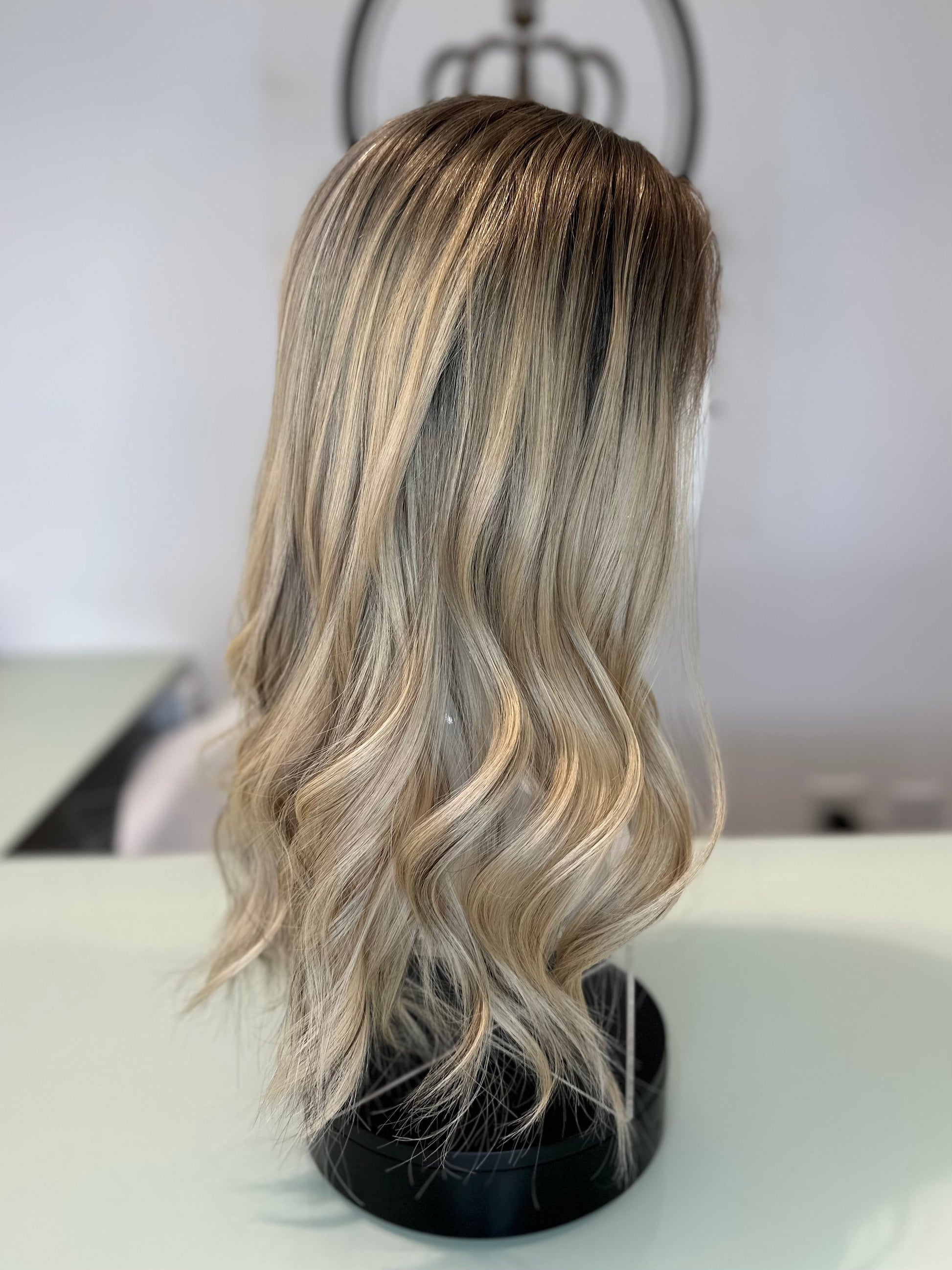 All of our wigs are 100% hand-tied: European human hair! The top is completely handtied strand by strand. (4”x4” Multidirectional skin top) This means your wig can be parted in any direction just like your own hair. It has a stretchy band with clasps to make sure the wig is fitted to your exact head size. Two clips are on each side so it can be clipped in for extra security on each side near your ears. If you have no hair at all you can wear our wig with a silicone wig gripper.