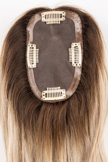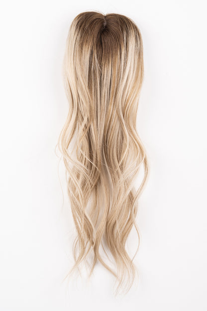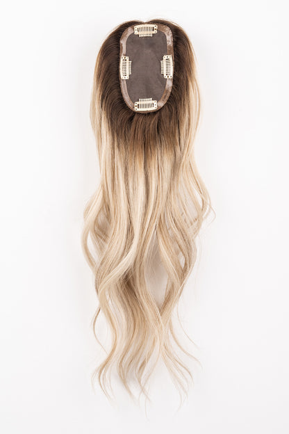 ***THIS IS A FINAL SALE PIECE: THIS CUSTOM COLOR PIECE CANNOT BE RETURNED OR EXCHANGED! Introducing this stunning custom colored topper "Iced Latte". She is a buttery Blonde! This is the only one of its kind, so act fast if you want your hands (or head) on it! This extension is great for women with medium to long hair that just want to add a little extra volume or cover those unwanted grays. It has a 3’’ by 5’’ base which clips in right around your roots.