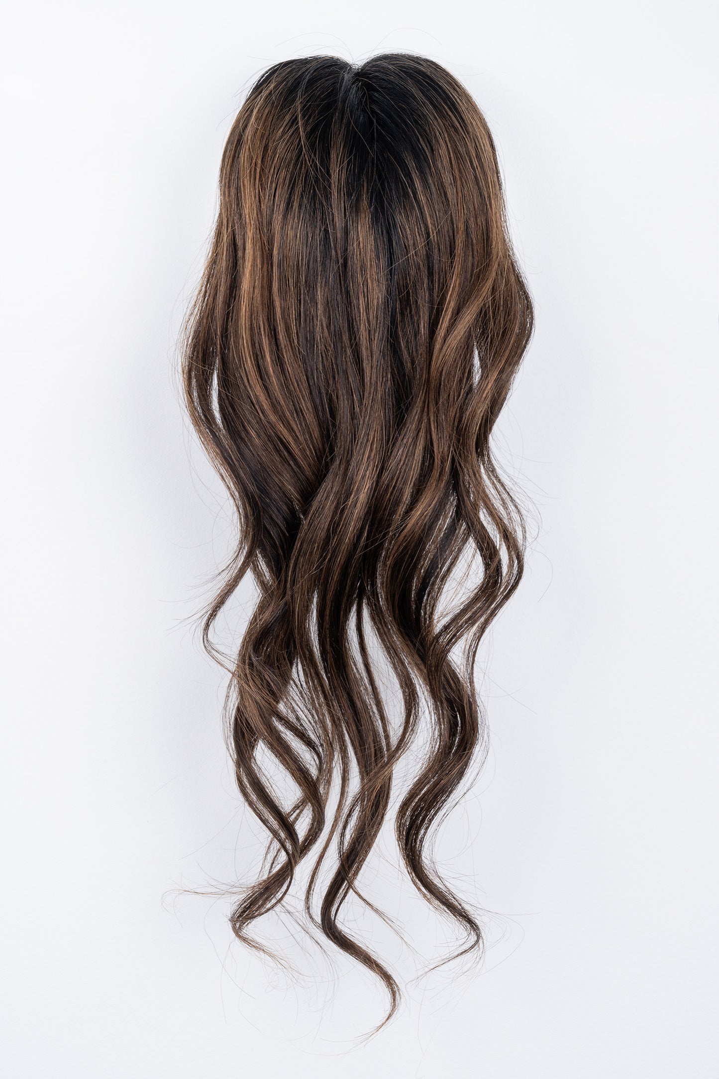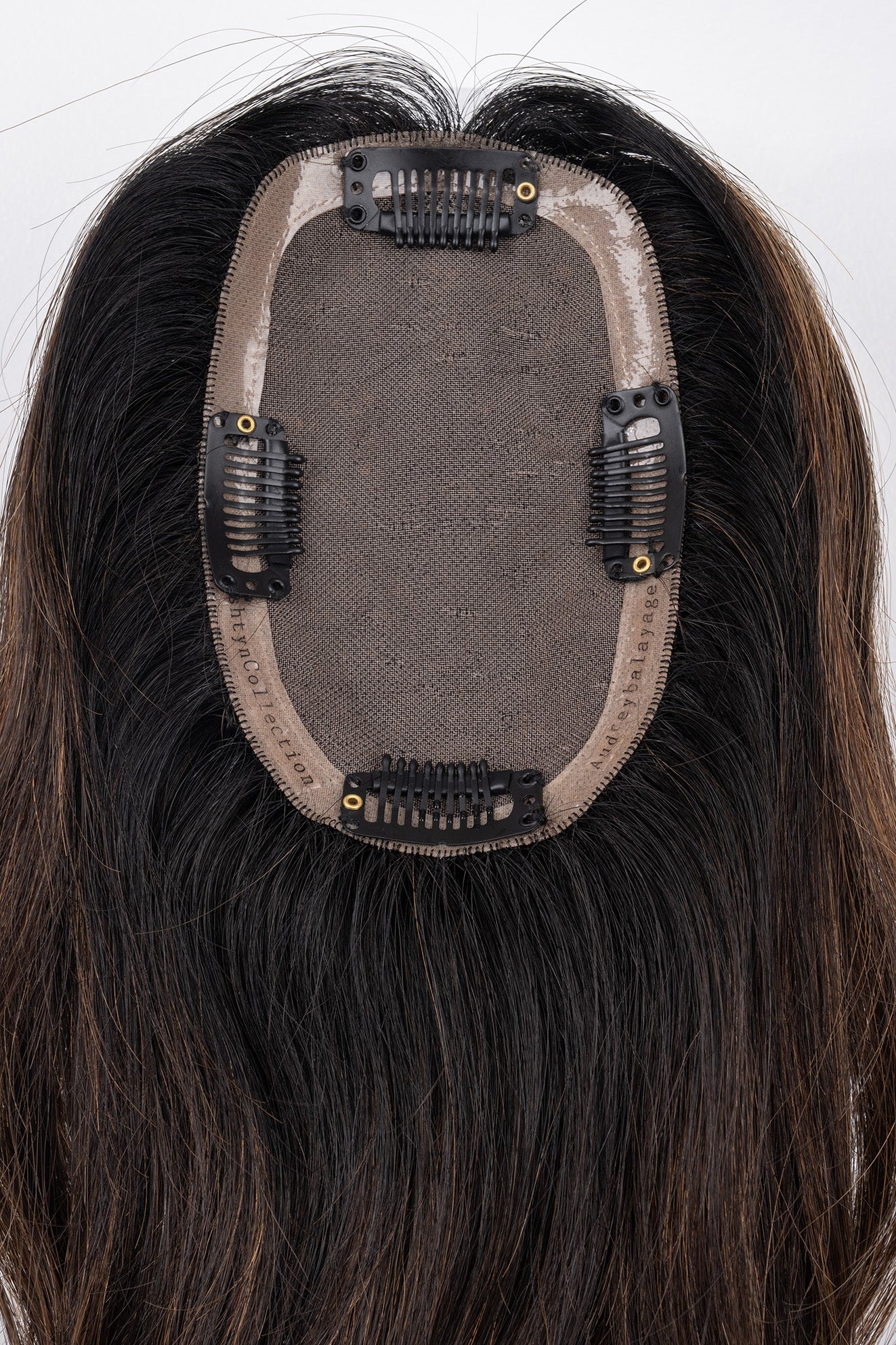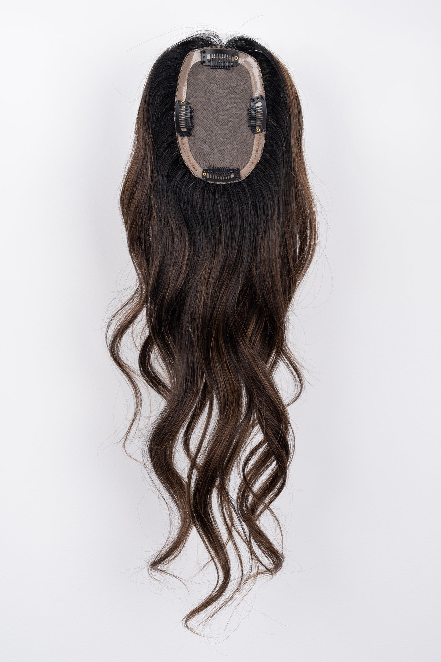 The Audrey Balayage Light Volume Hair Topper features a dark brown base with 2-3” dark brown roots blending into dark caramel and honey balayage highlights. Designed with 100% hand-tied: European human hair, this topper creates a natural, salon-finished balayage effect. Available only in 12-16” length, this clip-in European hair topper is perfect for those wanting multi-dimensional color with lightweight volume.
