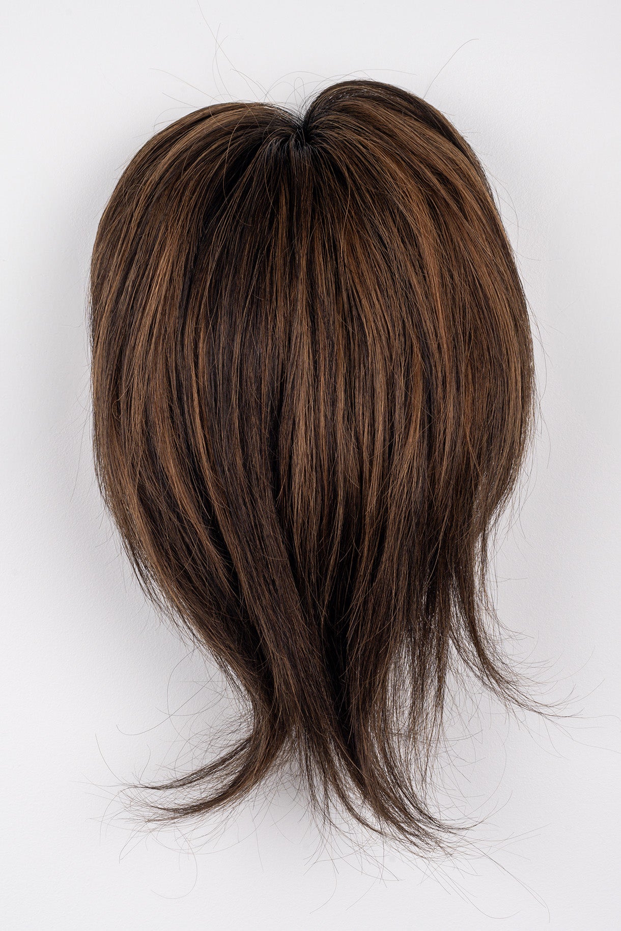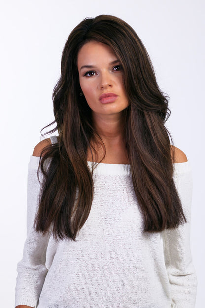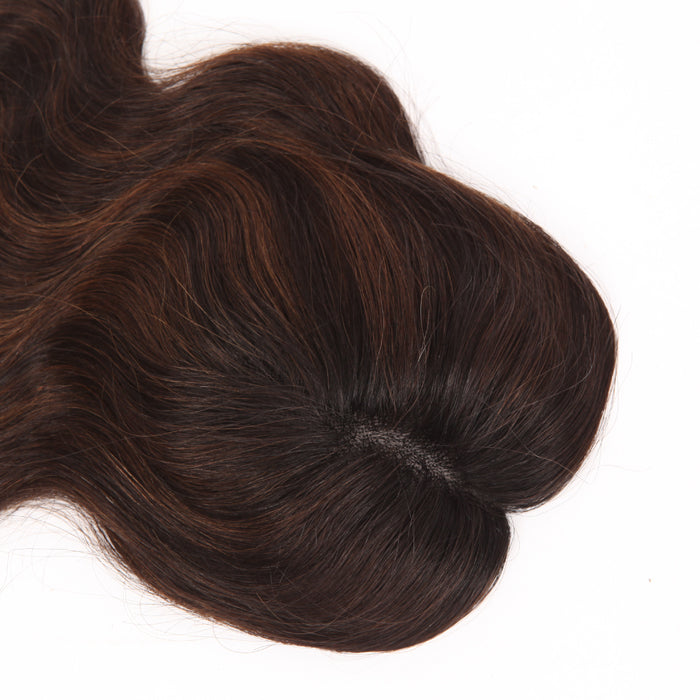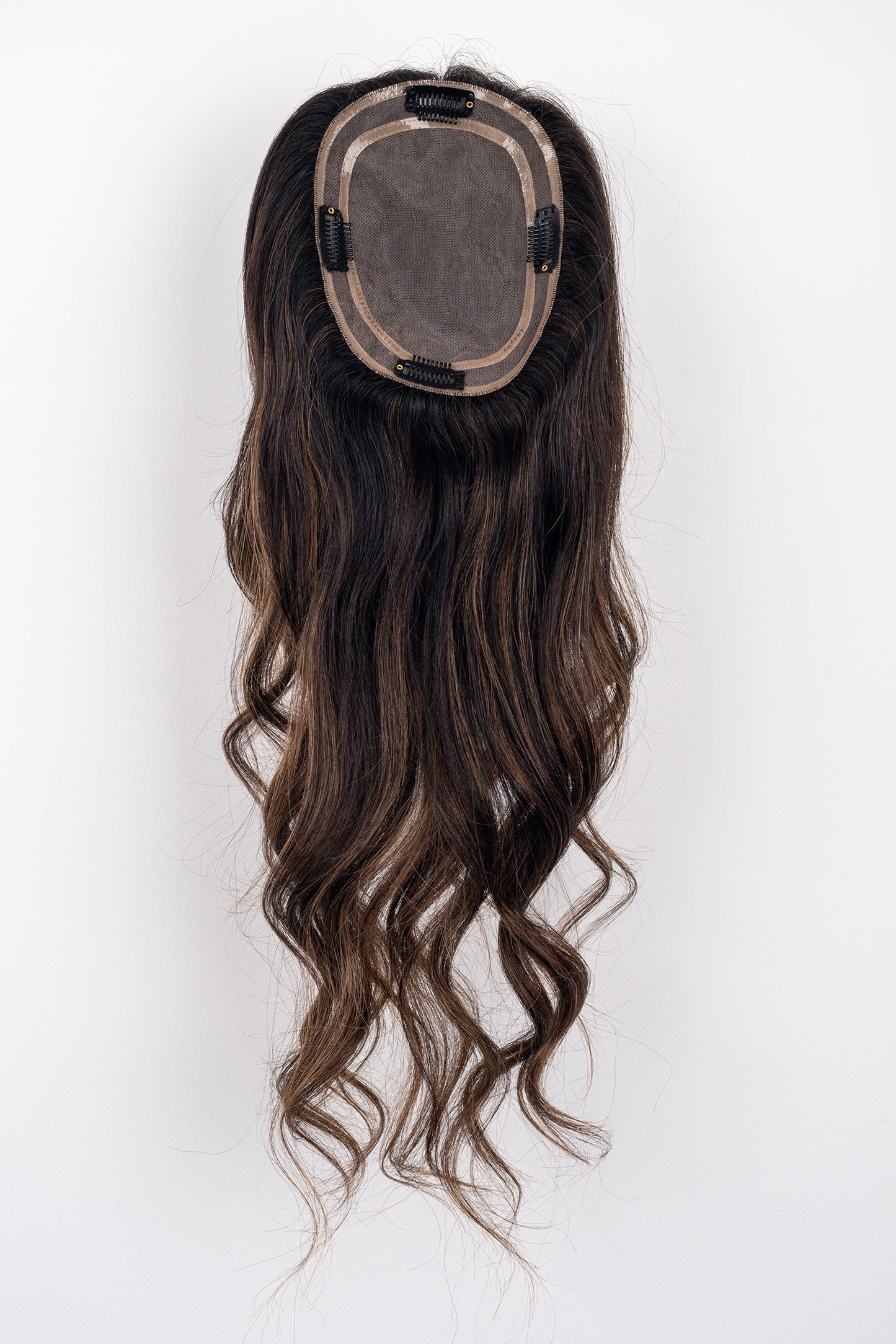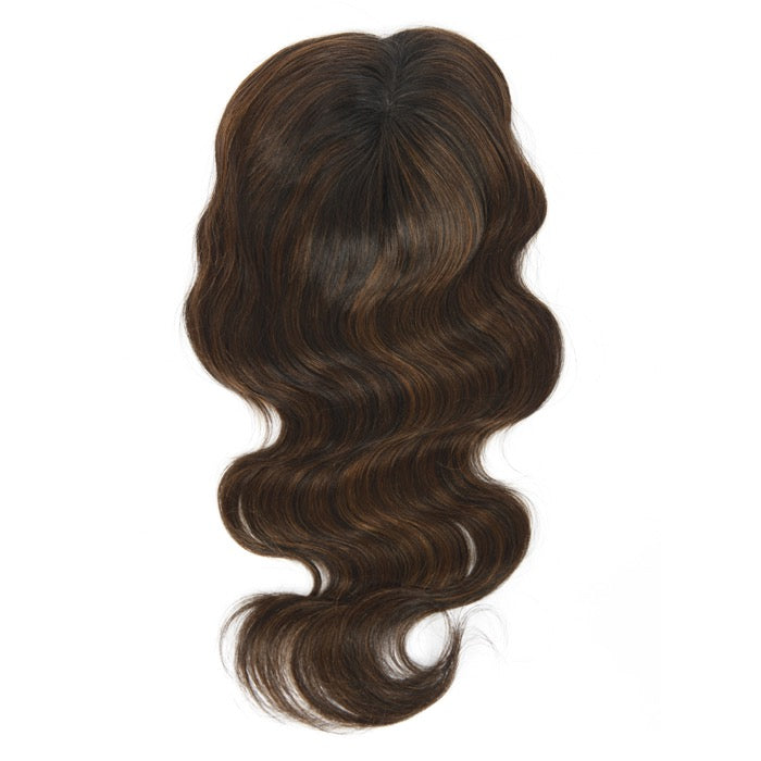 The Audrey Full Volume Hair Topper is a classic brunette shade featuring a very dark brown root with a dark brown base, slightly lighter than Midnight, and honey-caramel highlights. This 100% hand-tied: European human hair topper is designed for rich warmth and dimension, adding natural brightness. The hand-tied base ensures comfort and seamless blending, while the 100% Remy hair topper delivers softness and styling versatility. Available in 5-6” and 12-18” lengths, this clip-in hair topper offers fullness and a vibrant brunette tone.