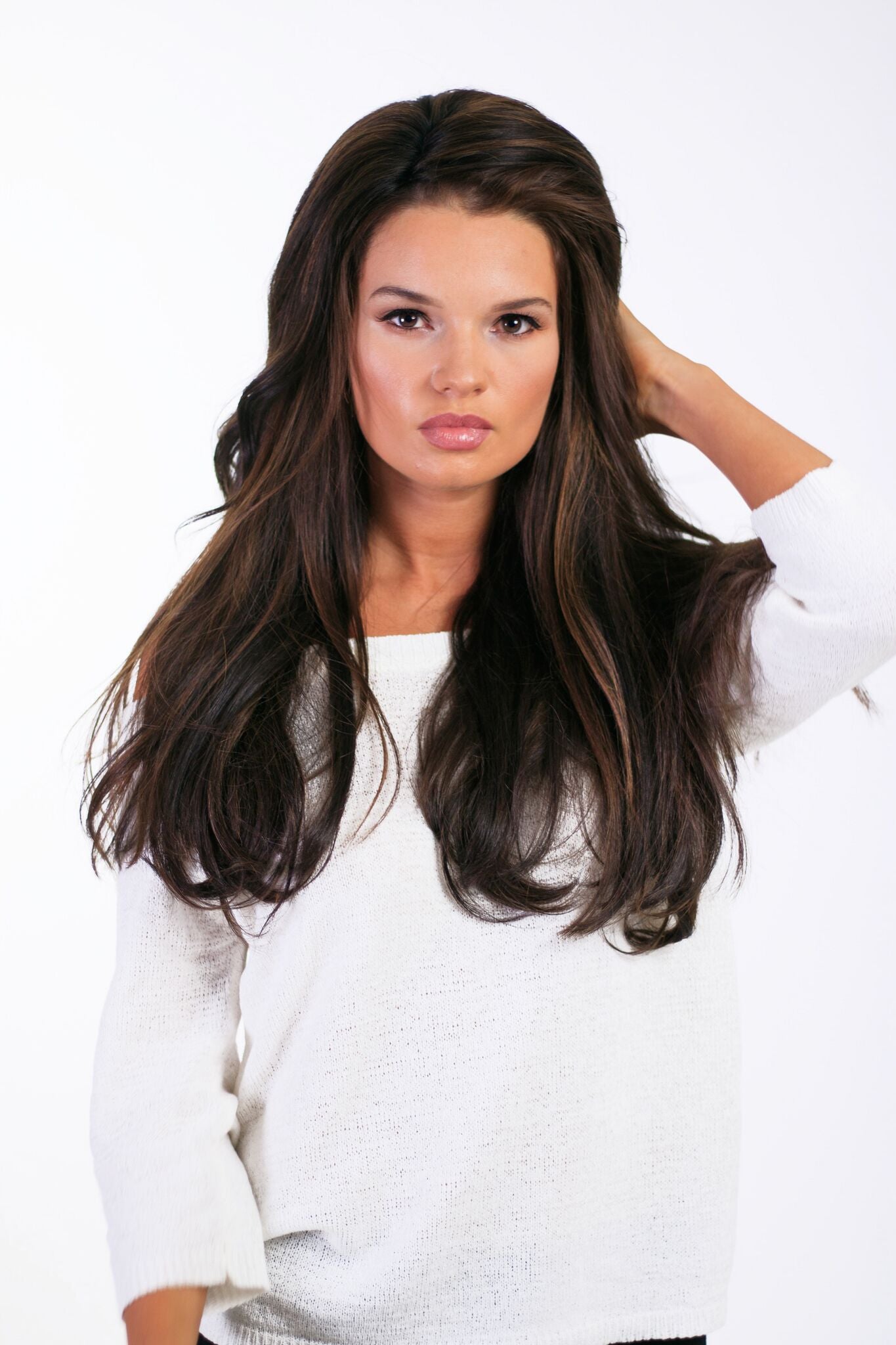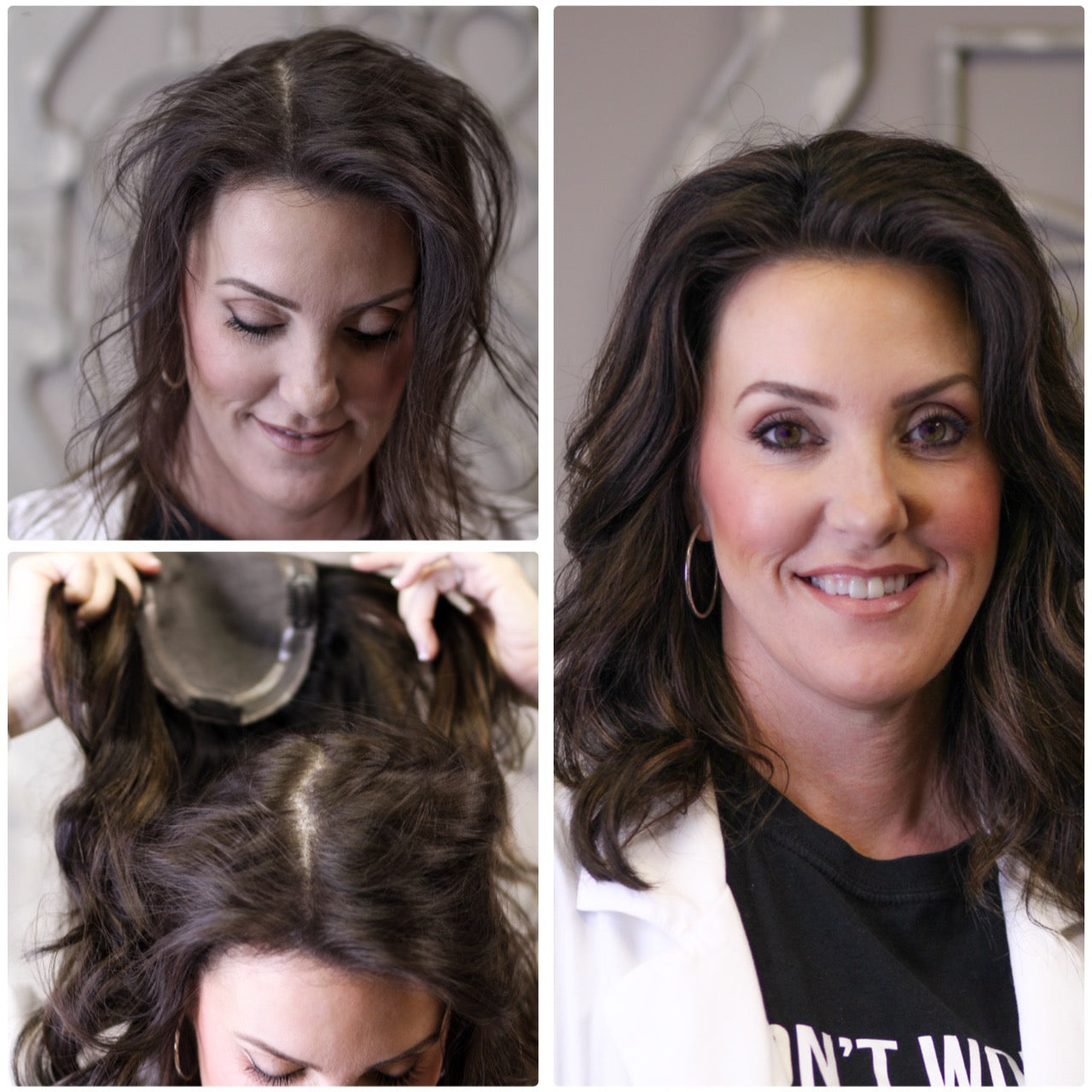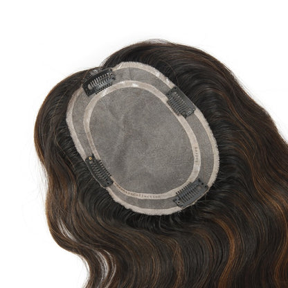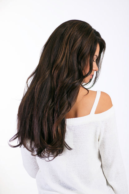 The Audrey Full Volume Hair Topper is a classic brunette shade featuring a very dark brown root with a dark brown base, slightly lighter than Midnight, and honey-caramel highlights. This 100% hand-tied: European human hair topper is designed for rich warmth and dimension, adding natural brightness. The hand-tied base ensures comfort and seamless blending, while the 100% Remy hair topper delivers softness and styling versatility. Available in 5-6” and 12-18” lengths, this clip-in hair topper offers fullness and a vibrant brunette tone.