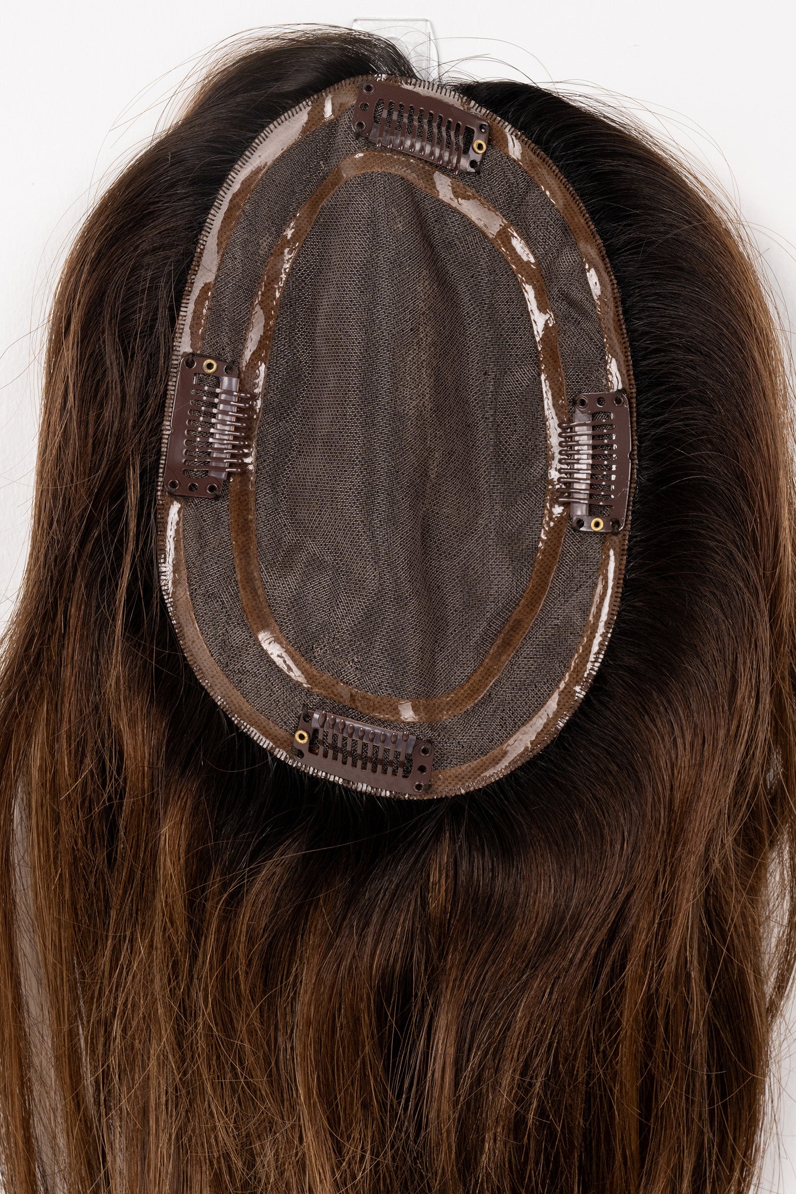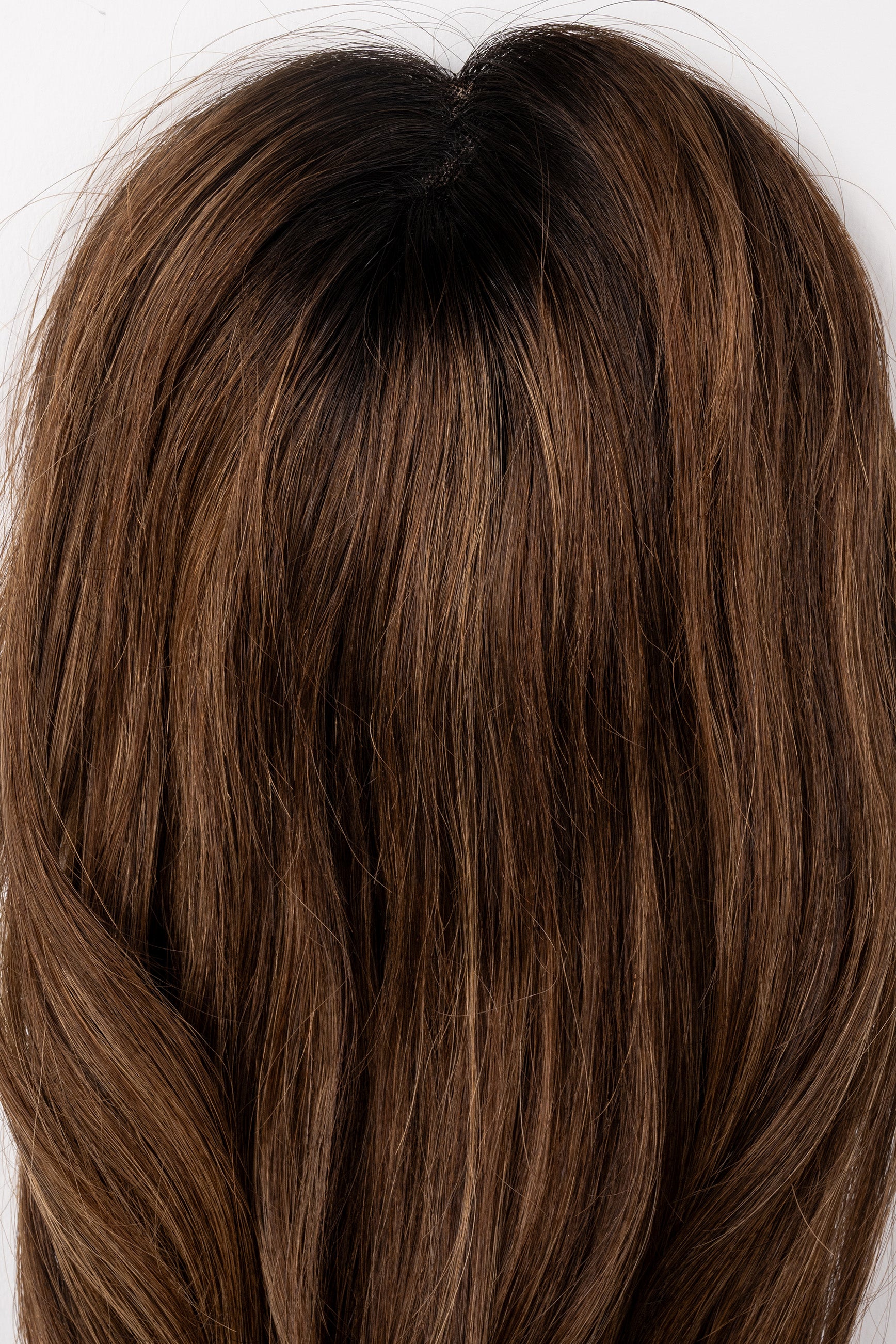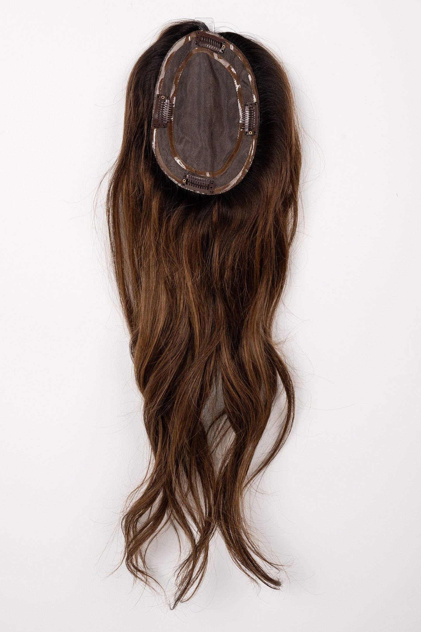 ***THIS IS A FINAL SALE PIECE: THIS CUSTOM COLOR PIECE CANNOT BE RETURNED OR EXCHANGED! Introducing this stunning custom colored topper "Caramel Cone". This is the only one of its kind, so act fast if you want your hands (or head) on it! The 12-18” full volume extension is the flagship piece in our collection and was first designed by our founder, Lauren Ashtyn, to be her own personal hairpiece. Long, thick, and luxurious, the full volume extension is 18 inches in length with 12” layers. The micro-mesh base is approximately 5”x 6”, which gives this hairpiece twice the density of the 12-16” light volume topper. This hairpiece is worn for maximum volume, length, and fullness. It is sufficiently large enough to cover any thinning spots on the sides and top of the head, as well as the crown and back of the head.