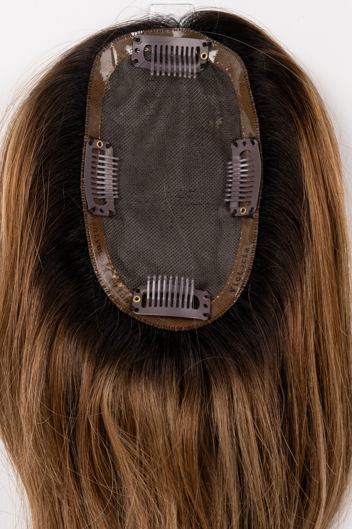 ***THIS IS A FINAL SALE PIECE: THIS CUSTOM COLOR PIECE CANNOT BE RETURNED OR EXCHANGED! Introducing this stunning custom colored topper "Cinnamon Ganache". This is the only one of its kind, so act fast if you want your hands (or head) on it! This extension is great for women with medium to long hair that just want to add a little extra volume or cover those unwanted grays. It has a 3’’ by 5’’ base which clips in right around your roots.