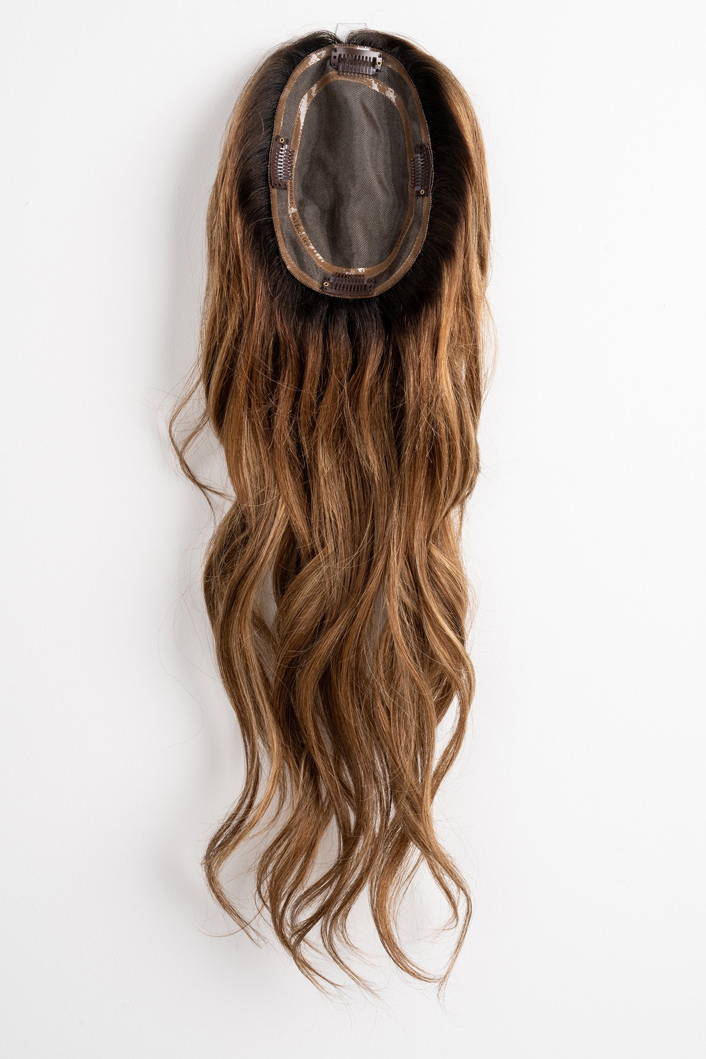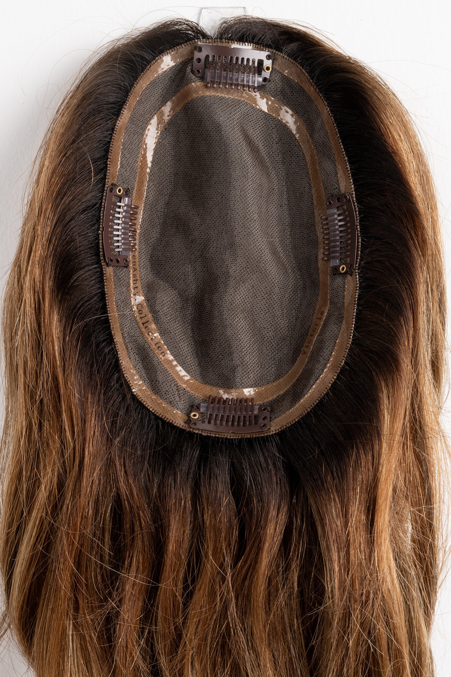 ***THIS IS A FINAL SALE PIECE: THIS CUSTOM COLOR PIECE CANNOT BE RETURNED OR EXCHANGED! Introducing this stunning custom colored topper "Clouded Maple". This is the only one of its kind, so act fast if you want your hands (or head) on it! The 12-18” full volume extension is the flagship piece in our collection and was first designed by our founder, Lauren Ashtyn, to be her own personal hairpiece. Long, thick, and luxurious, the full volume extension is 18 inches in length with 12” layers. The micro-mesh base is approximately 5”x 6”, which gives this hairpiece twice the density of the 12-16” light volume topper. This hairpiece is worn for maximum volume, length, and fullness. It is sufficiently large enough to cover any thinning spots on the sides and top of the head, as well as the crown and back of the head.