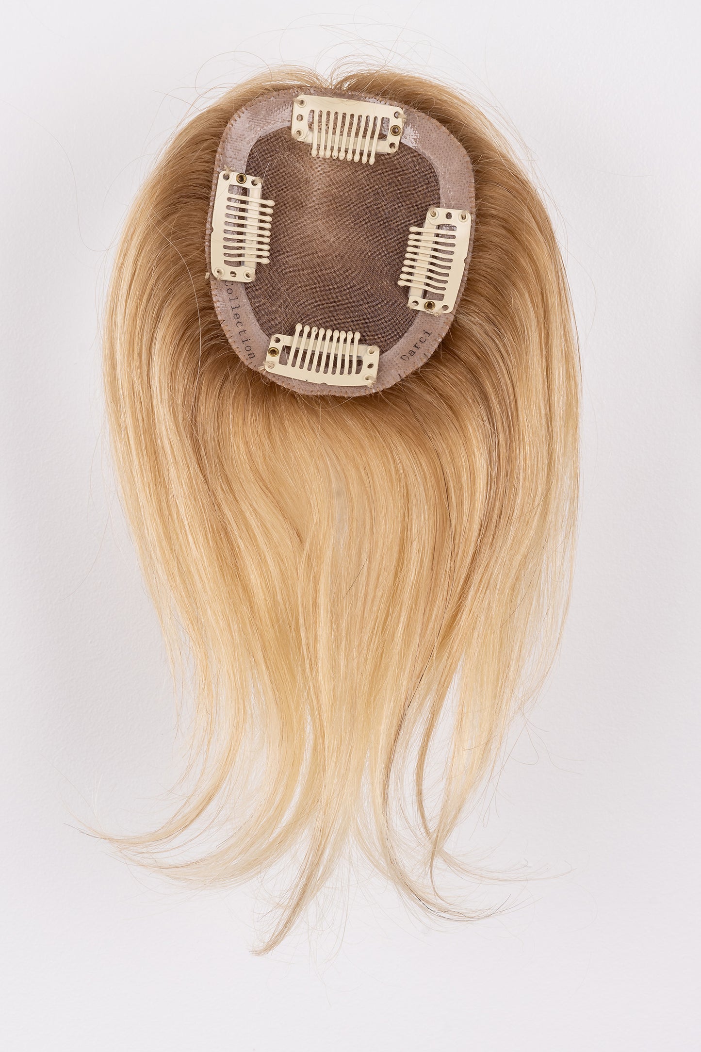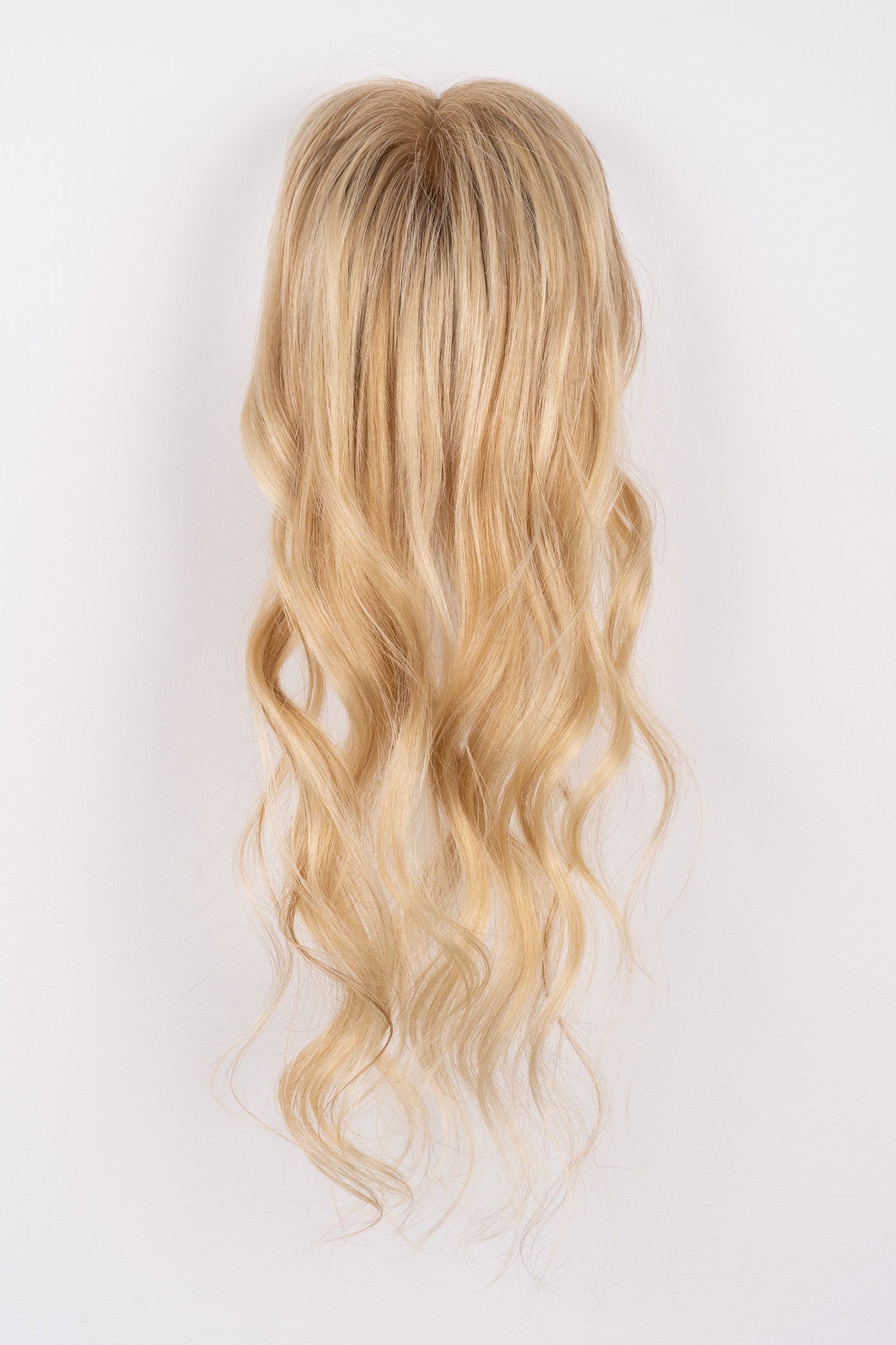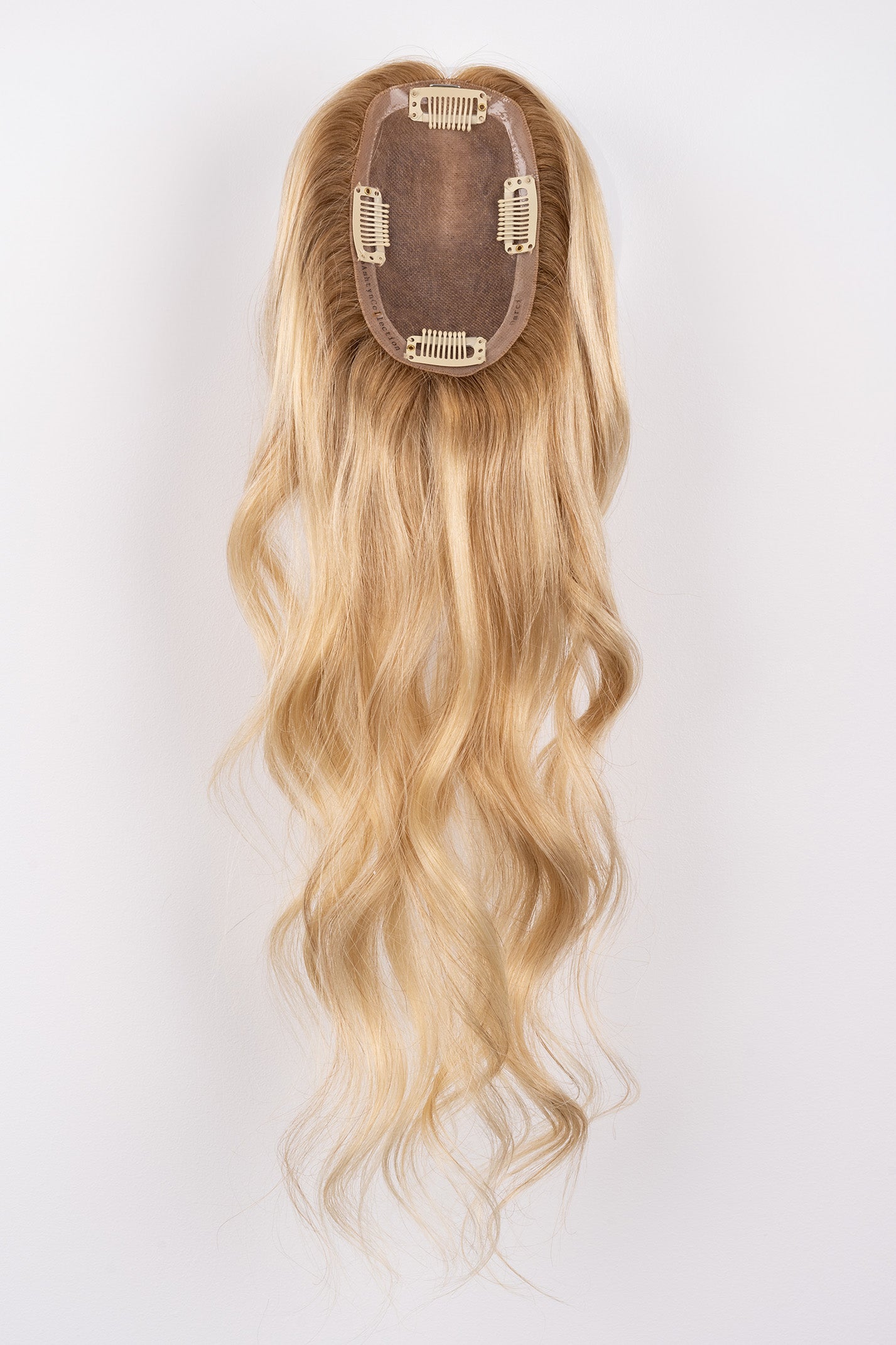 The Darci Light Volume Hair Topper is a golden warm blonde shade with dark blonde roots and dimensional lowlights, offering a natural, sunlit appearance. This 100% hand-tied: European hair topper ensures lightweight volume and comfortable wear, blending seamlessly with blonde tones. Available in 5-6” and 12-16” lengths, this clip-in human hair topper is ideal for those wanting multi-tonal blonde highlights with natural depth.