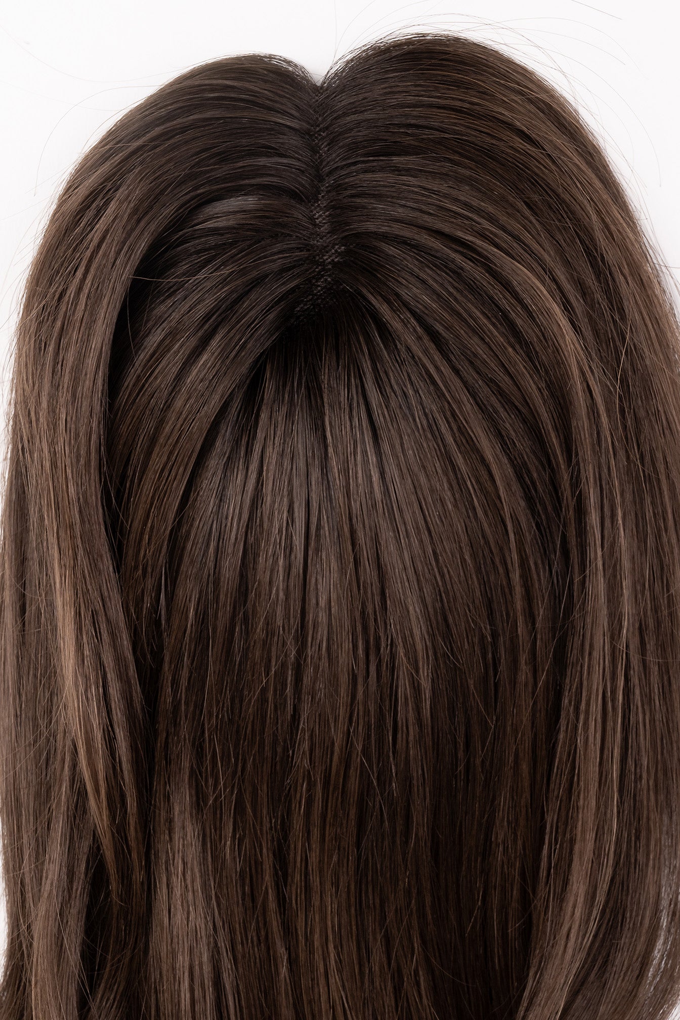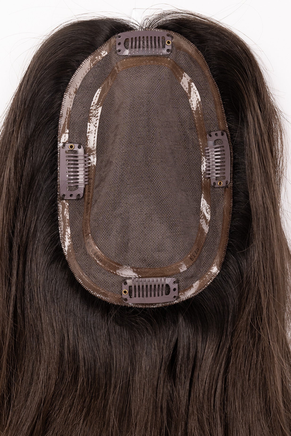 ***THIS IS A FINAL SALE PIECE: THIS CUSTOM COLOR PIECE CANNOT BE RETURNED OR EXCHANGED! Introducing this stunning custom colored topper, "Deep Earth". This is the only one of its kind, so act fast if you want your hands (or head) on it! The 12-18” full volume extension is the flagship piece in our collection and was first designed by our founder, Lauren Ashtyn, to be her own personal hairpiece. Long, thick, and luxurious, the full volume extension is 18 inches in length with 12” layers. The micro-mesh base is approximately 5”x 6”, which gives this hairpiece twice the density of the 12-16” light volume topper. This hairpiece is worn for maximum volume, length, and fullness. It is sufficiently large enough to cover any thinning spots on the sides and top of the head, as well as the crown and back of the head.