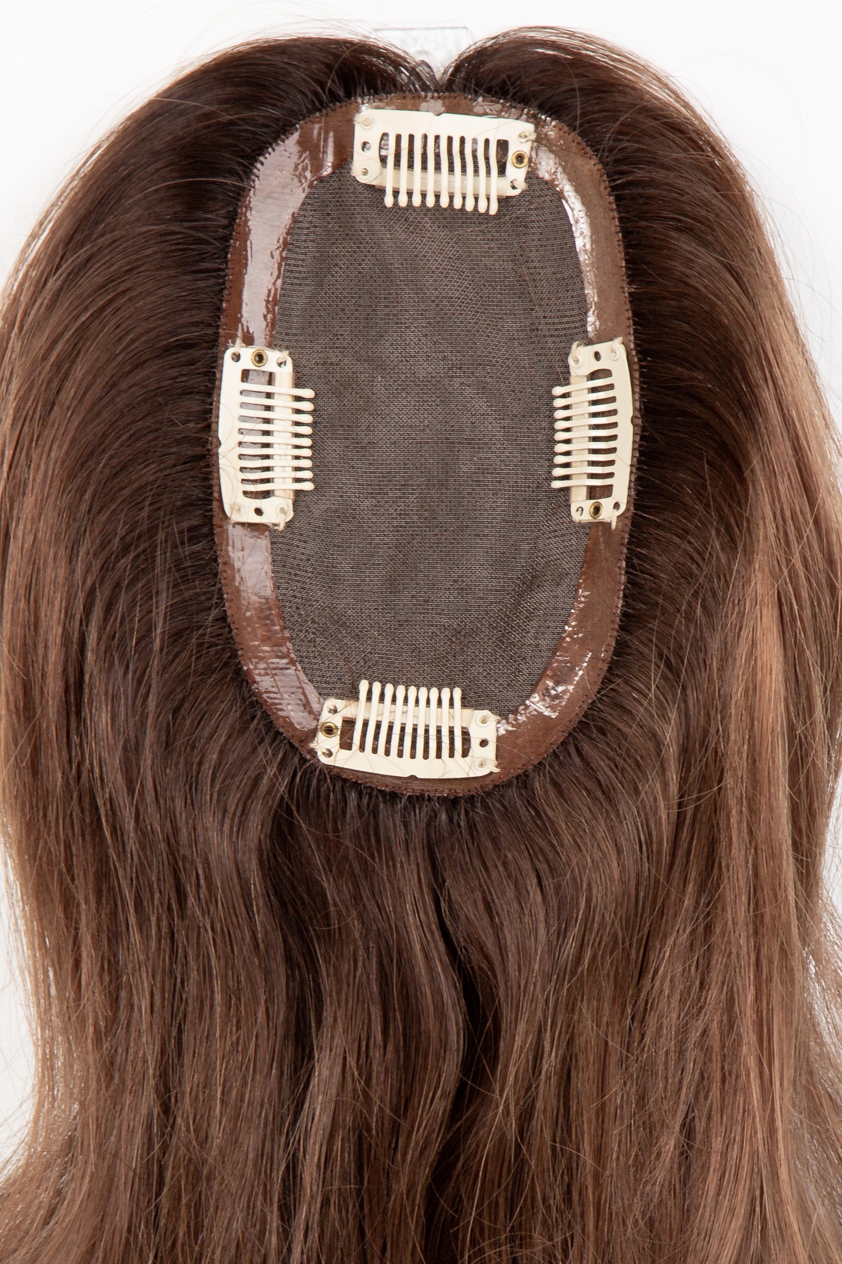 ***THIS IS A FINAL SALE PIECE: THIS CUSTOM COLOR PIECE CANNOT BE RETURNED OR EXCHANGED!  Introducing this stunning custom colored topper "Deepwood Glow". This is the only one of its kind, so act fast if you want your hands (or head) on it! This extension is great for women with medium to long hair that just want to add a little extra volume or cover those unwanted grays. It has a 3’’ by 5’’ base which clips in right around your roots.