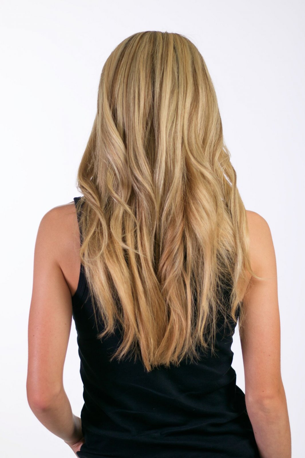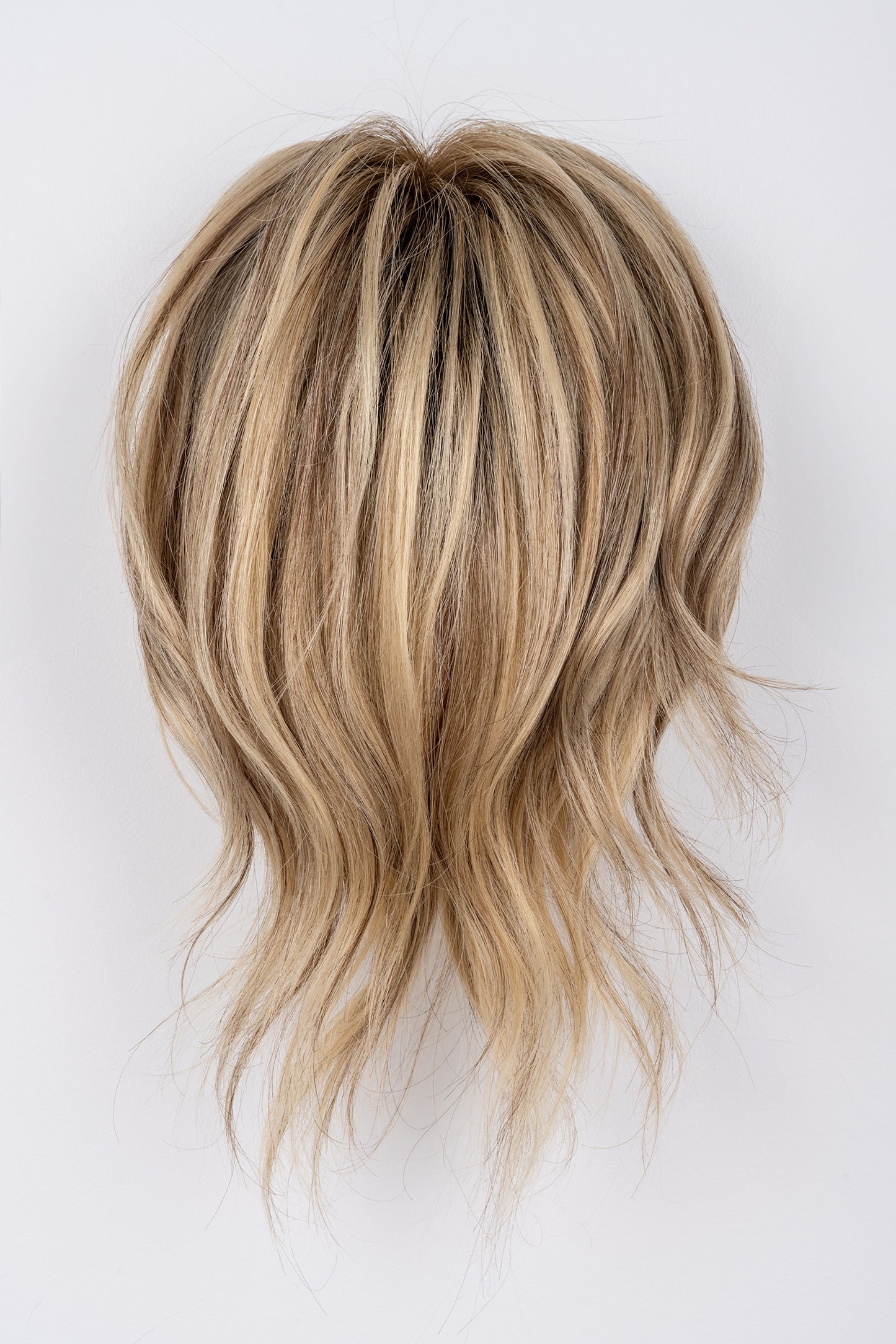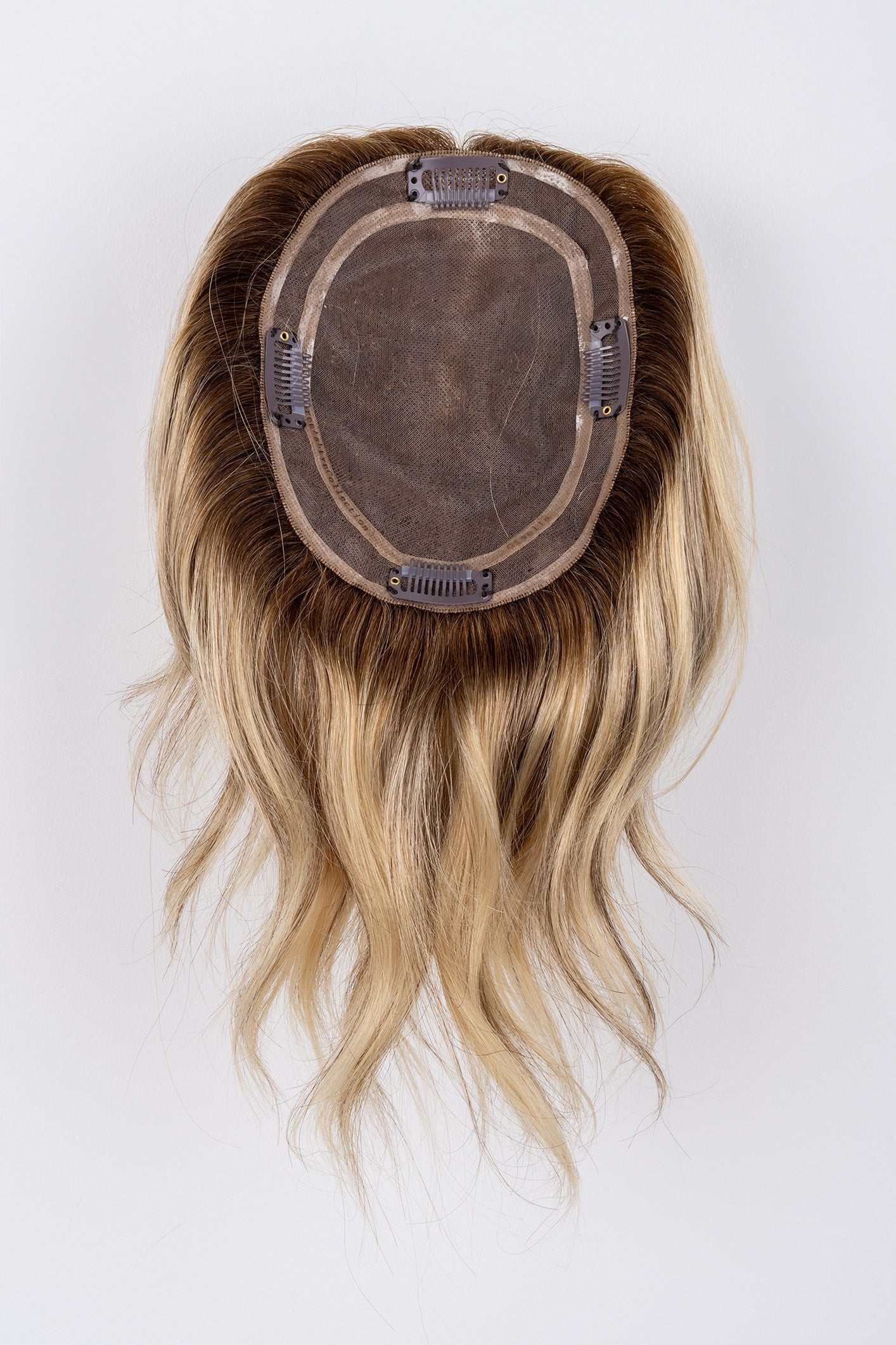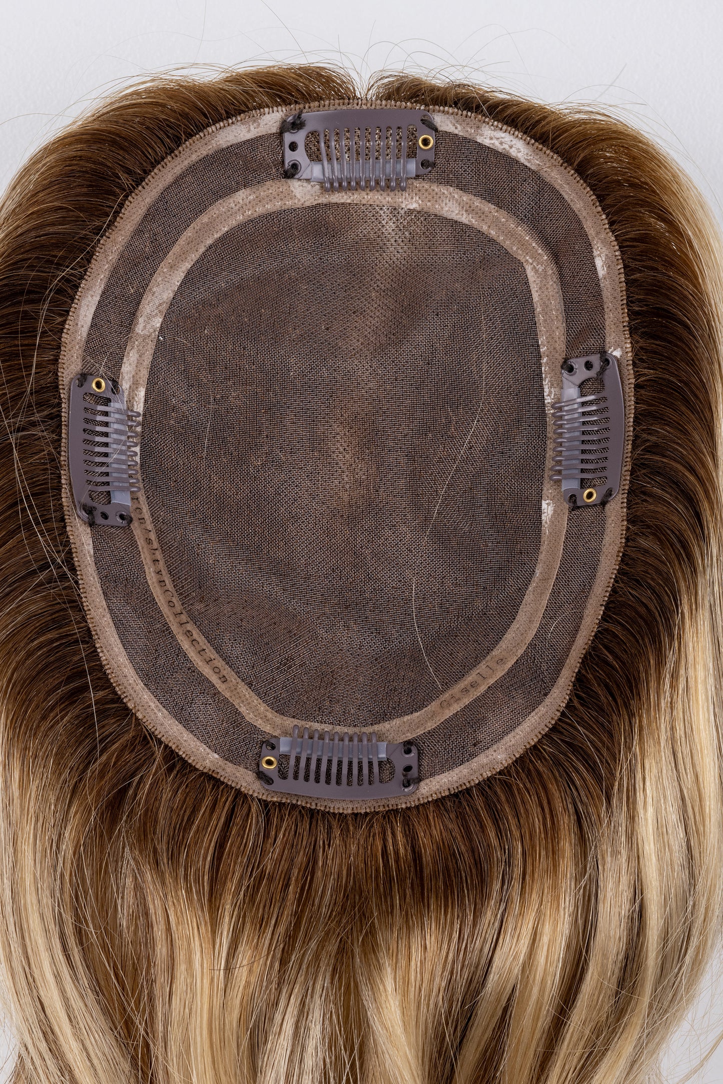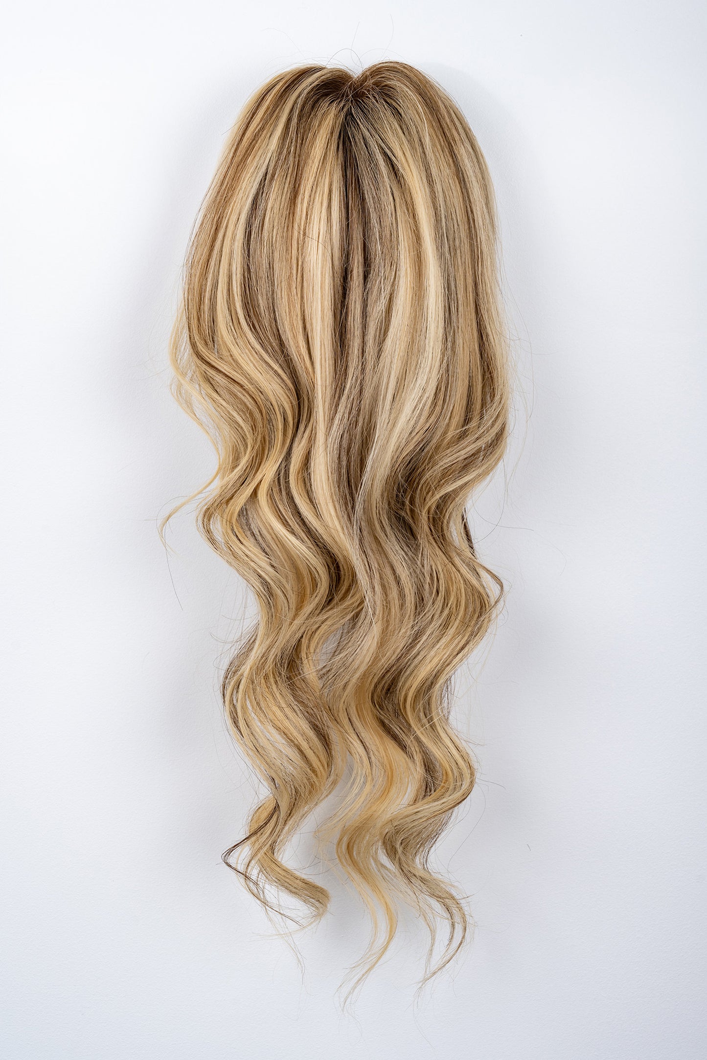 The Giselle Full Volume Hair Topper is one of the most popular colors, featuring a neutral gold shade with a light to medium brown root and chunky lowlights. This 100% hand-tied: European human hair topper offers a sun-kissed, natural effect, perfect for those looking for warmth and dimension. Available in 5-6” and 12-18” lengths, this clip-in Remy human hair topper ensures volume and seamless blending.
