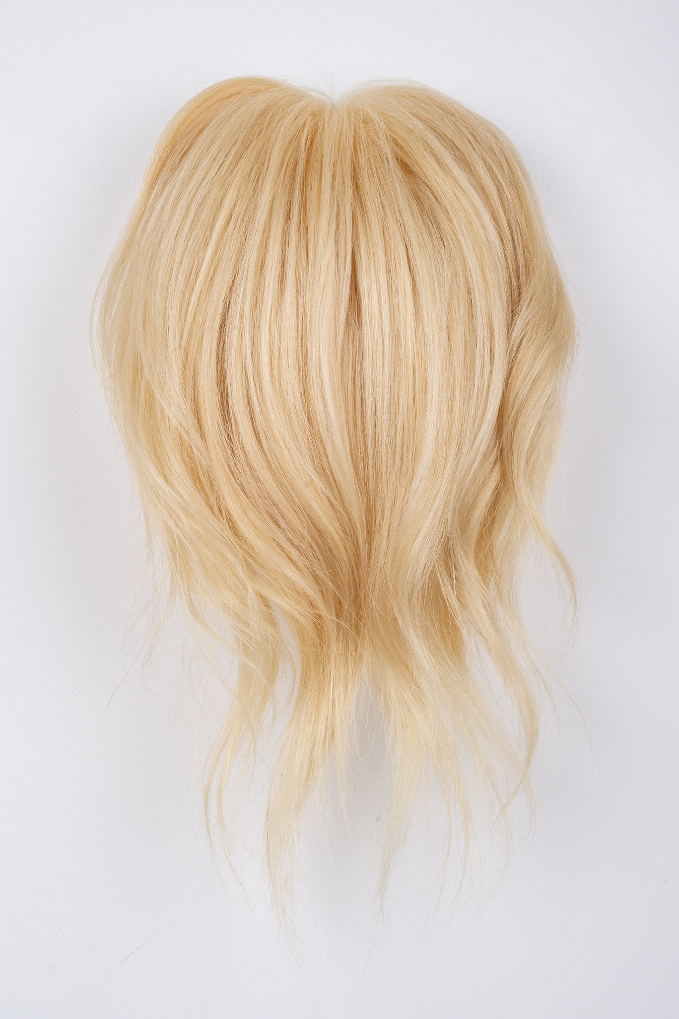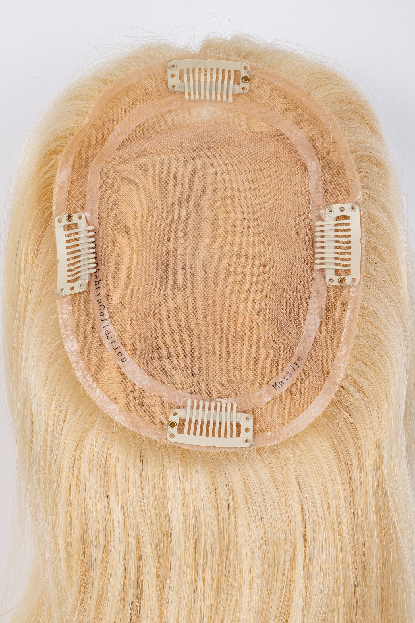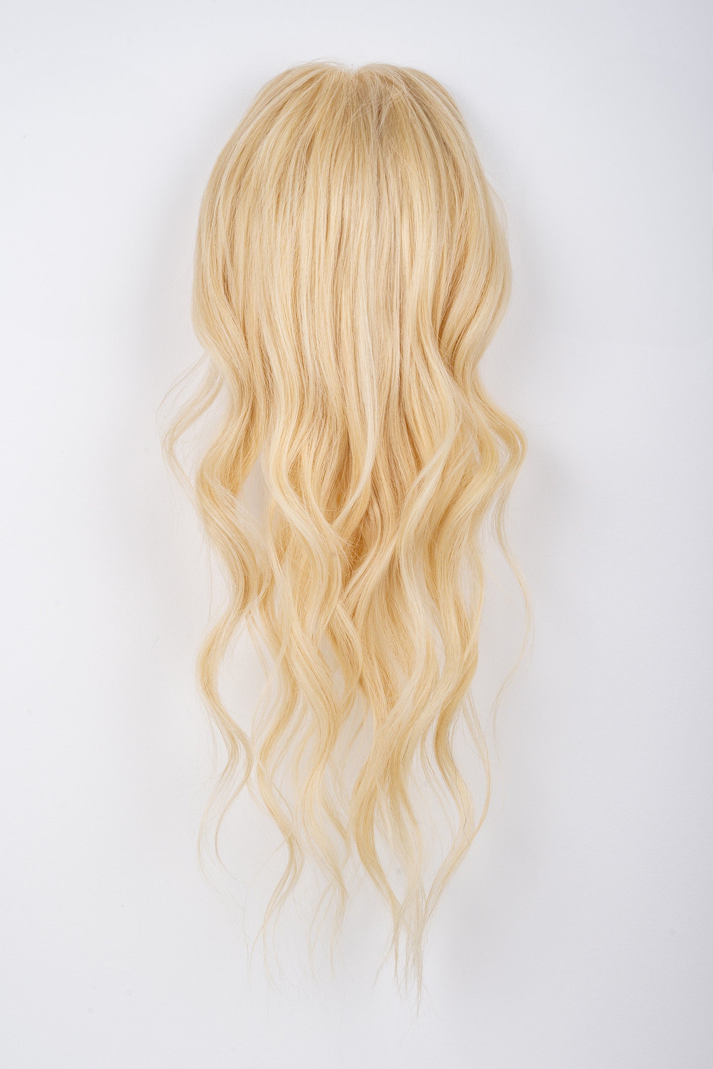 The Marilyn Full Volume Hair Topper is a warm light golden blonde shade with no added root or lowlights, offering a classic, sun-kissed blonde look. This 100% hand-tied: European human hair topper is perfect for those who prefer a solid blonde color with lightweight volume. The hand-tied construction ensures a scalp-like appearance, while the 100% Remy human hair topper allows for versatile styling. Available in 5-6” and 12-18” lengths, this clip-in hair topper provides elegant, natural-looking fullness.