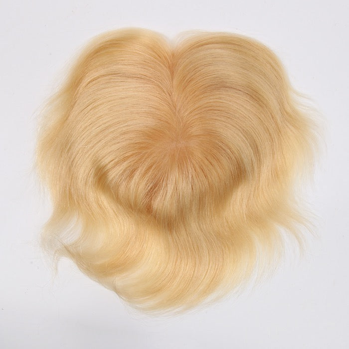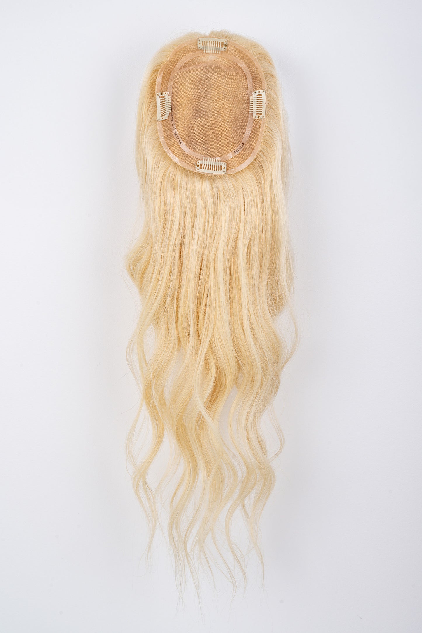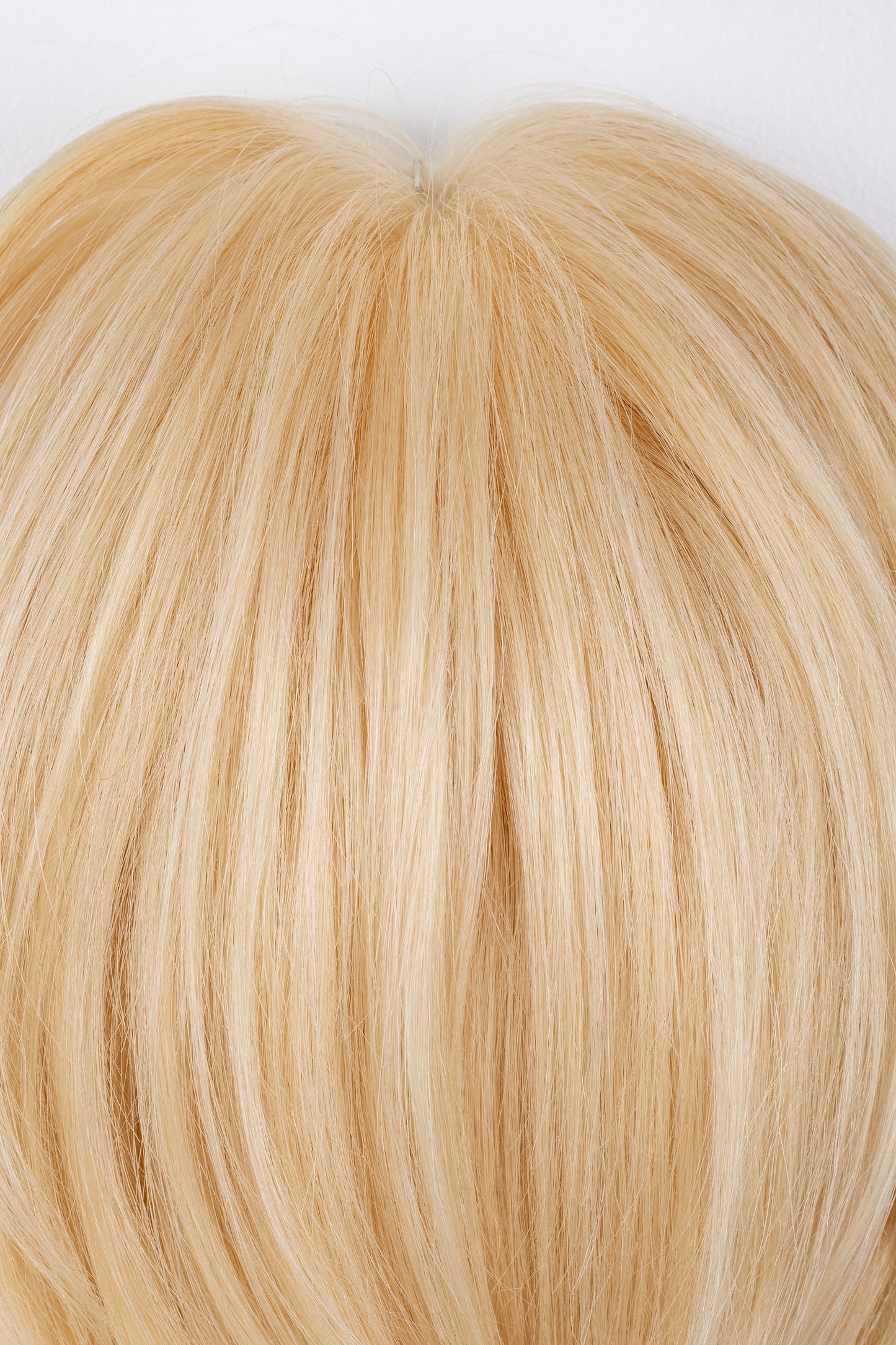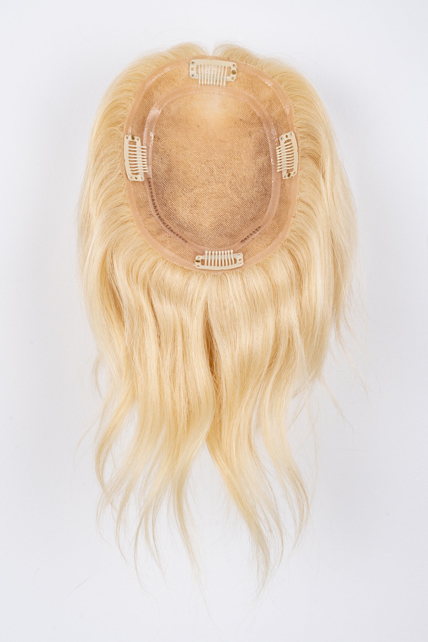 The Marilyn Full Volume Hair Topper is a warm light golden blonde shade with no added root or lowlights, offering a classic, sun-kissed blonde look. This 100% hand-tied: European human hair topper is perfect for those who prefer a solid blonde color with lightweight volume. The hand-tied construction ensures a scalp-like appearance, while the 100% Remy human hair topper allows for versatile styling. Available in 5-6” and 12-18” lengths, this clip-in hair topper provides elegant, natural-looking fullness.