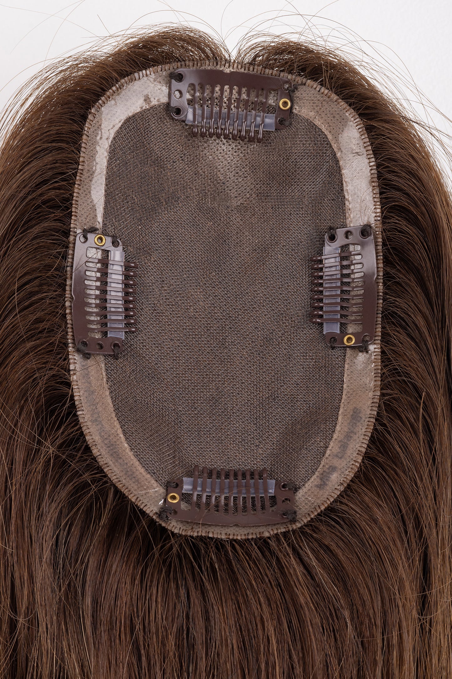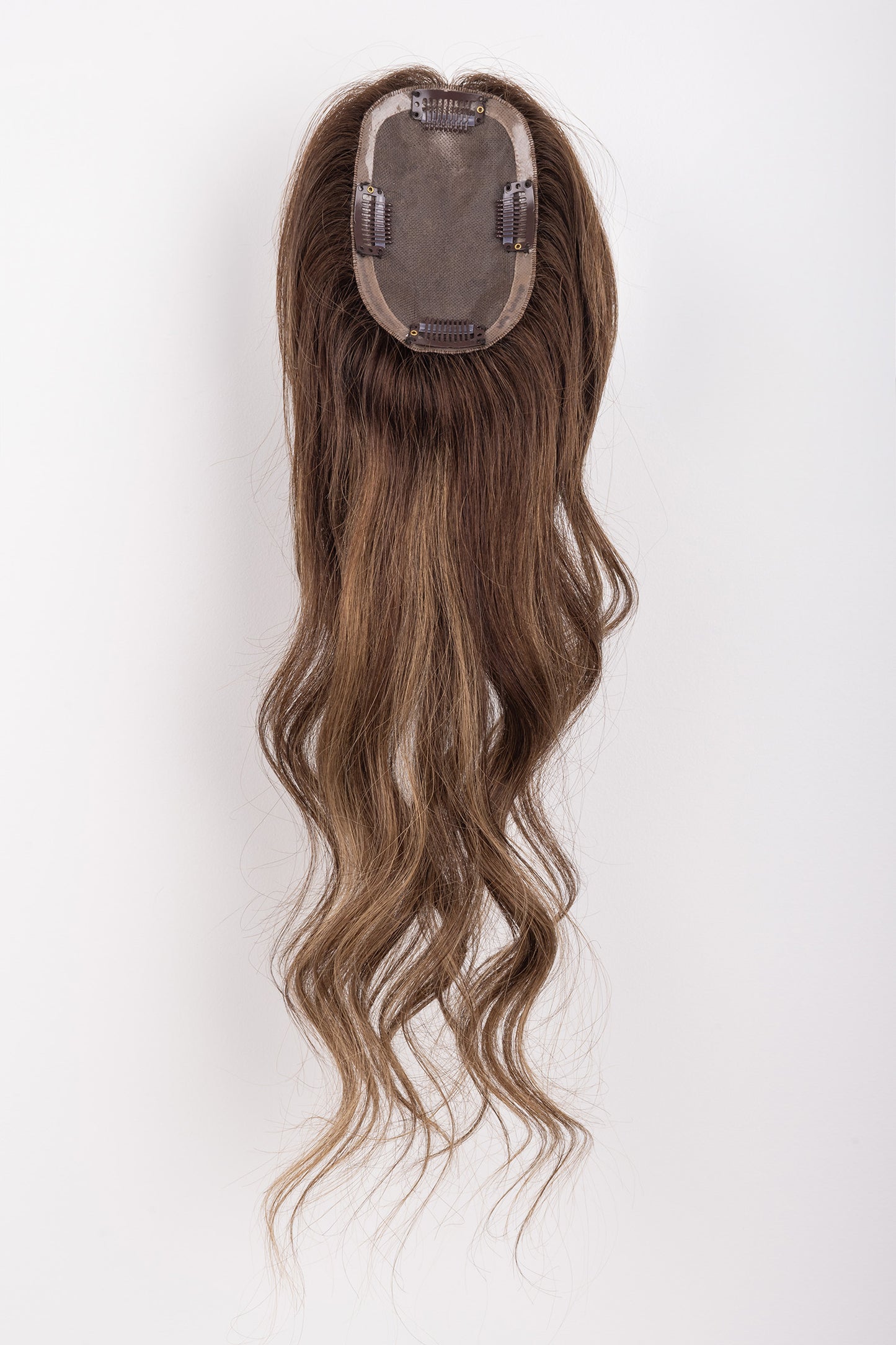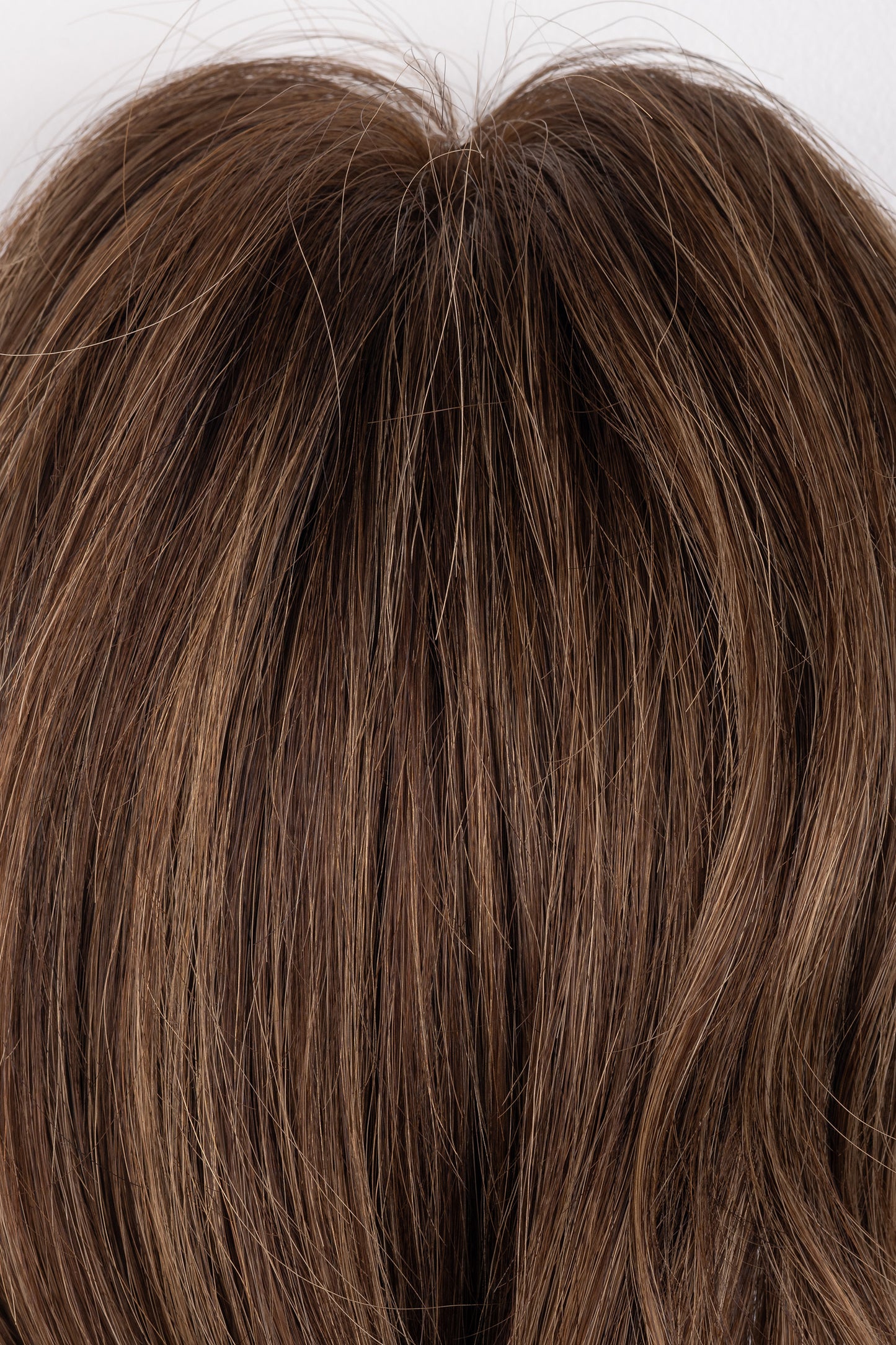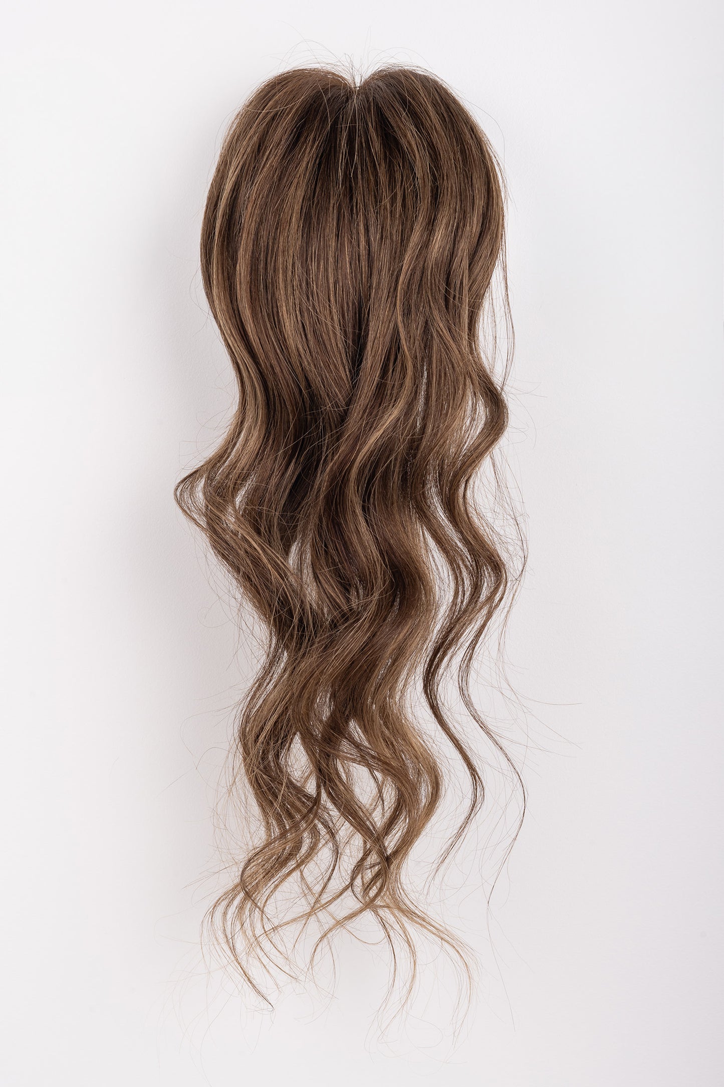 The Mila Balayage Light Volume Hair Topper features a medium brown root blending into a medium blonde balayage throughout, creating a soft, dimensional highlight effect. This 100% hand-tied: European human hair topper is hand-painted for a natural, sun-kissed look that mimics salon balayage techniques. The hand-tied construction provides seamless blending, ensuring a scalp-like finish. Available only in 12-16” length, the Mila Balayage hair topper is ideal for those who love a low-maintenance, naturally highlighted blonde look.