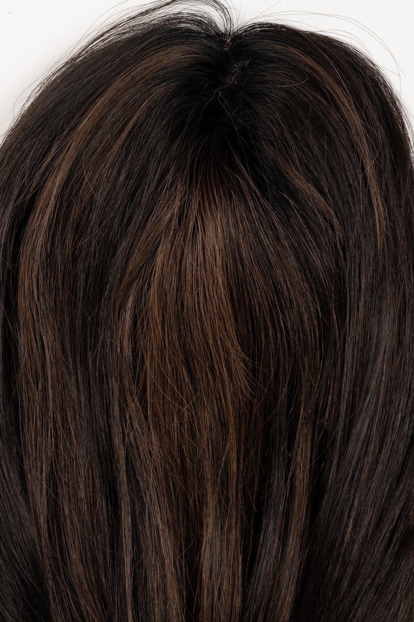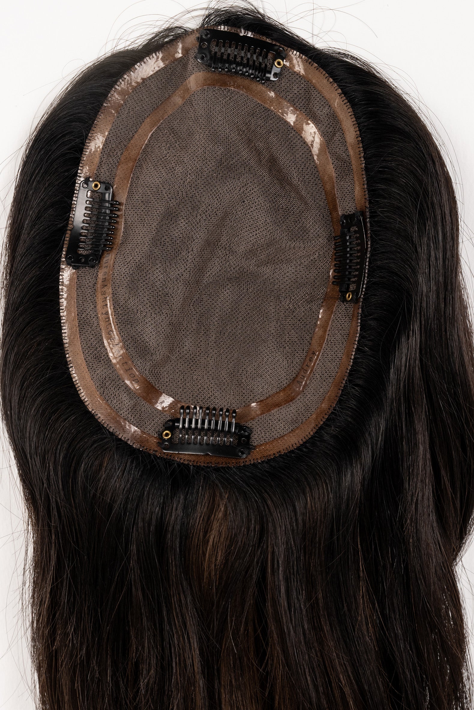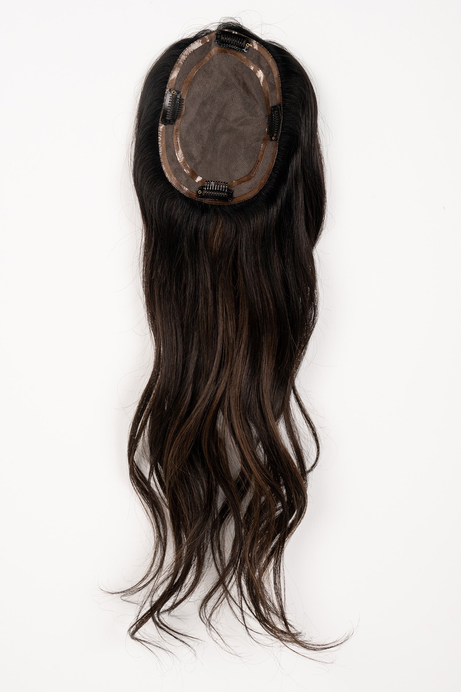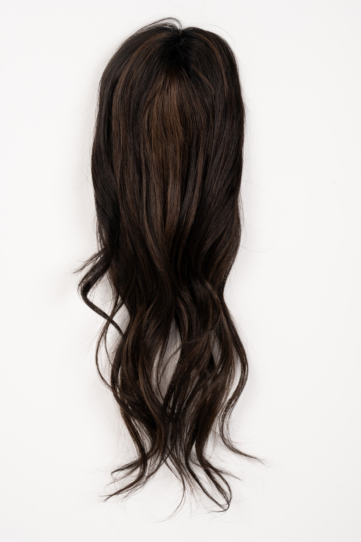 ***THIS IS A FINAL SALE PIECE: THIS CUSTOM COLOR PIECE CANNOT BE RETURNED OR EXCHANGED! Introducing this stunning custom colored topper "Misty Night". This is the only one of its kind, so act fast if you want your hands (or head) on it! The 12-18” full volume extension is the flagship piece in our collection and was first designed by our founder, Lauren Ashtyn, to be her own personal hairpiece. Long, thick, and luxurious, the full volume extension is 18 inches in length with 12” layers. The micro-mesh base is approximately 5”x 6”, which gives this hairpiece twice the density of the 12-16” light volume topper. This hairpiece is worn for maximum volume, length, and fullness. It is sufficiently large enough to cover any thinning spots on the sides and top of the head, as well as the crown and back of the head.