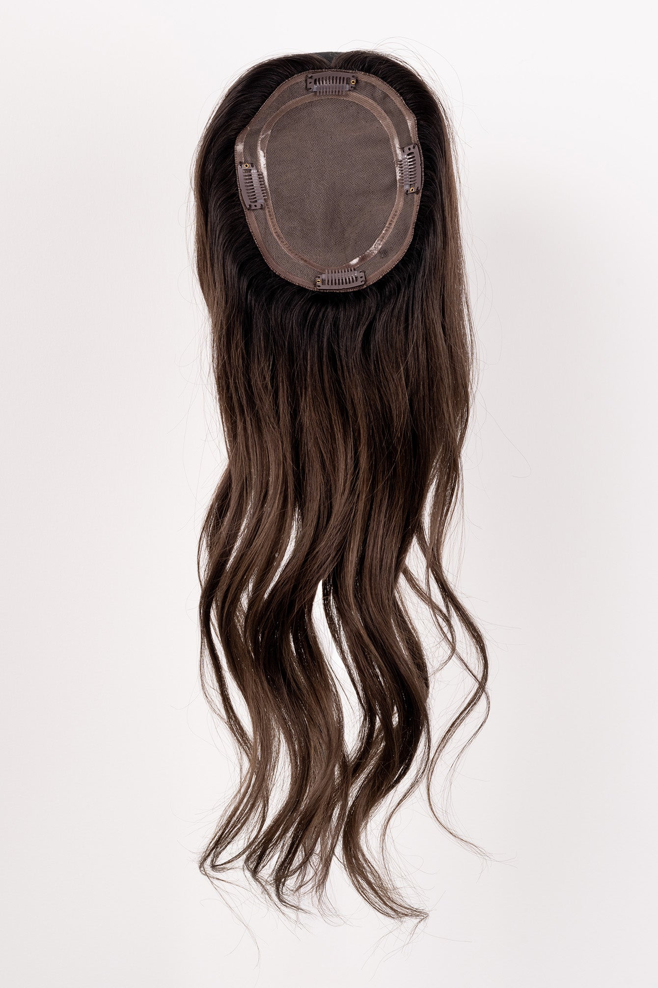 Introducing this stunning custom colored topper "Mocha". She is a dark, ash brown. This is the only one of its kind, so act fast if you want your hands (or head) on it!The 12-18” full volume extension is the flagship piece in our collection and was first designed by our founder, Lauren Ashtyn, to be her own personal hairpiece. Long, thick, and luxurious, the full volume extension is 18 inches in length with 12” layers. The micro-mesh base is approximately 5”x 6”, which gives this hairpiece twice the density of the 12-16” light volume topper.This hairpiece is worn for maximum volume, length, and fullness. It is sufficiently large enough to cover any thinning spots on the sides and top of the head, as well as the crown and back of the head.
