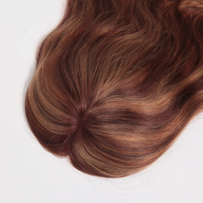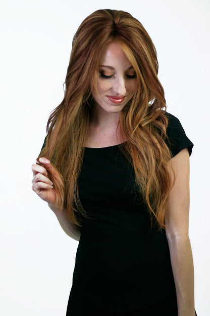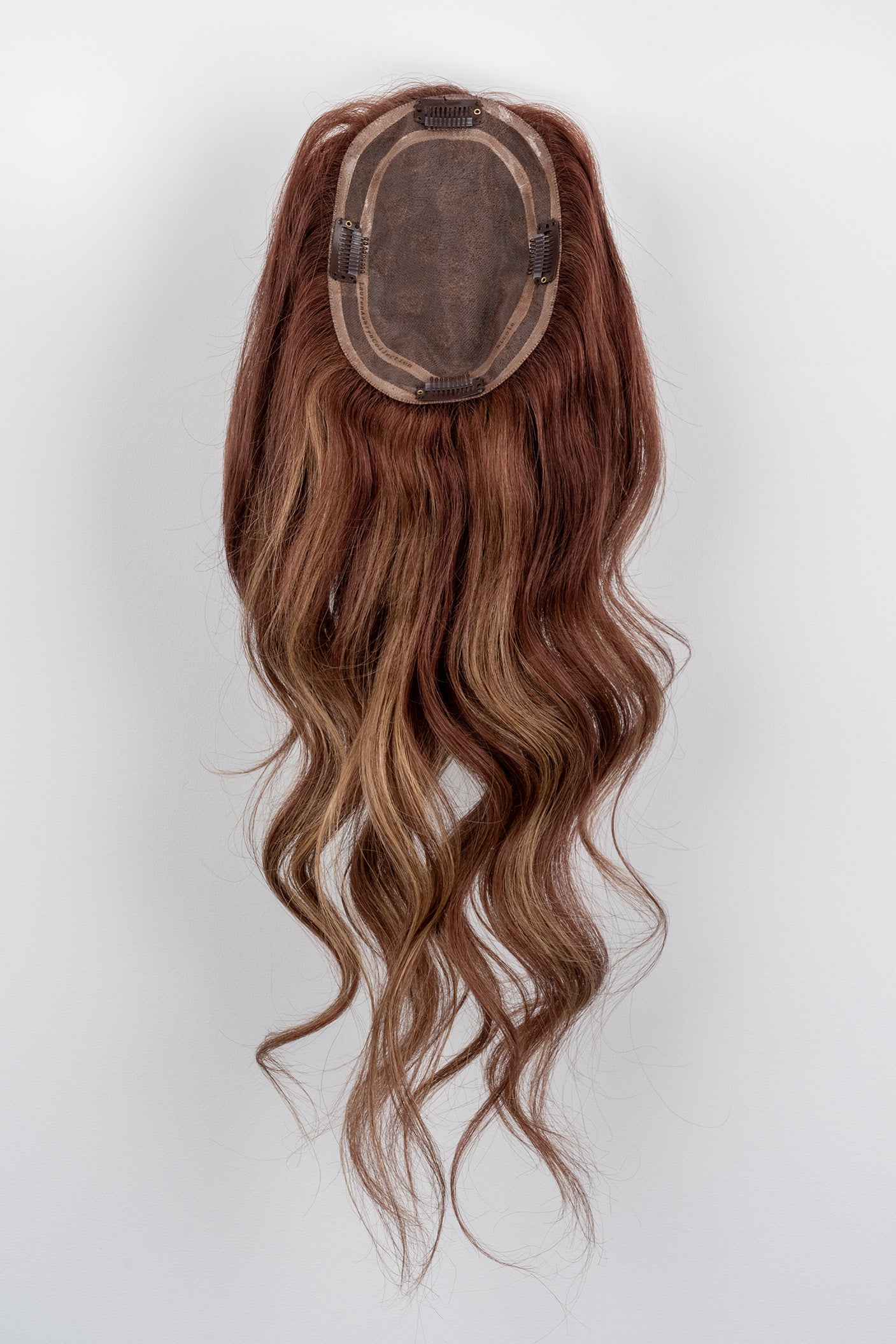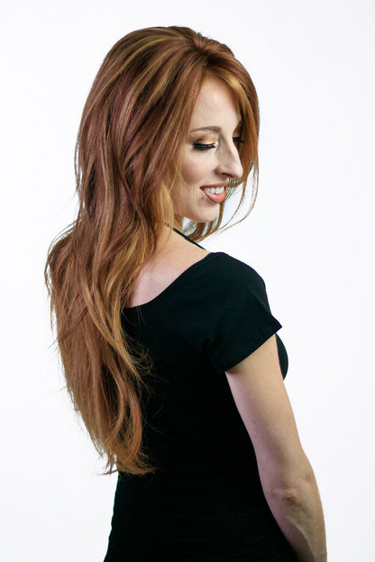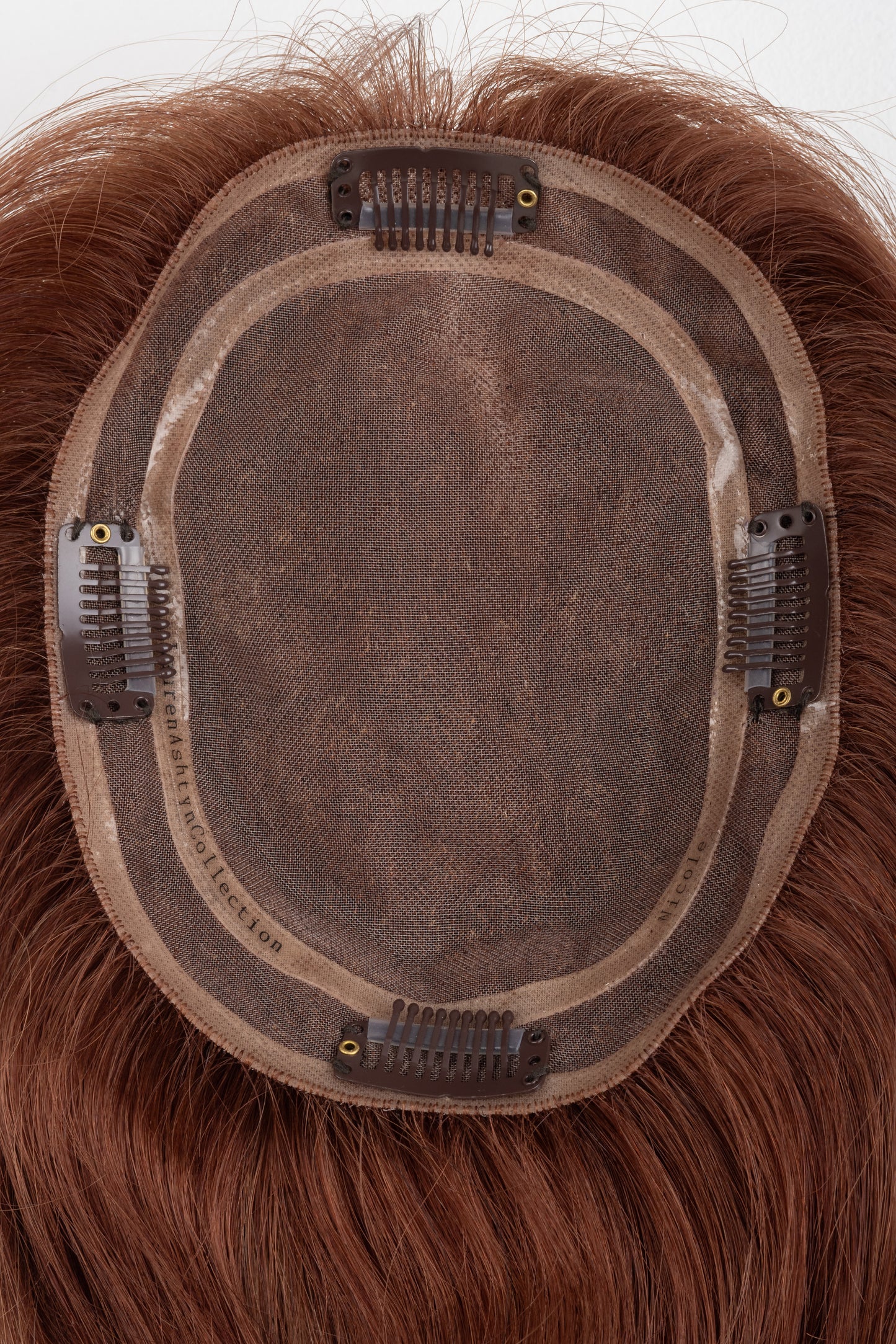 The Nicole Full Volume Hair Topper is a striking spicy warm medium red shade with golden blonde highlights and a warm red 1-inch root base, offering a vibrant and bold color option. This 100% hand-tied: European human hair topper is ideal for those looking to enhance their natural auburn hues or add a rich, fiery dimension to their hair. The hand-tied design ensures a seamless, natural blend, while the 100% Remy human hair topper provides versatility, softness, and long-lasting durability. Available in 5-6” and 12-18” lengths, the Nicole clip-in hair topper offers beautiful movement, volume, and full coverage.