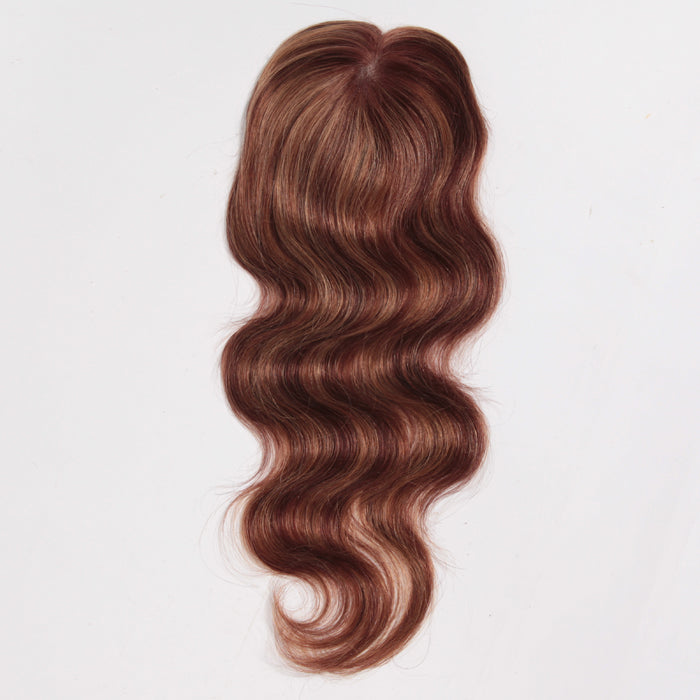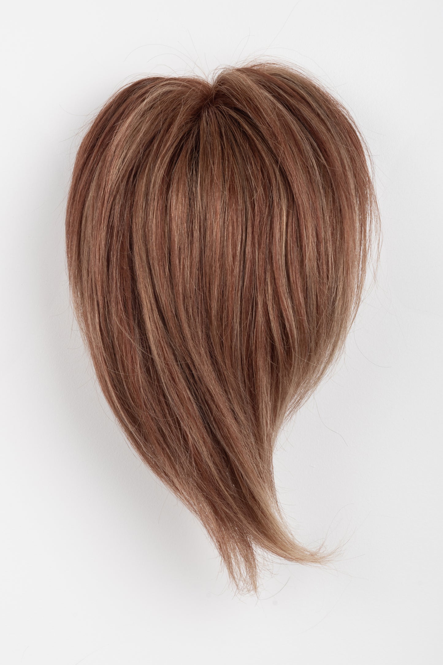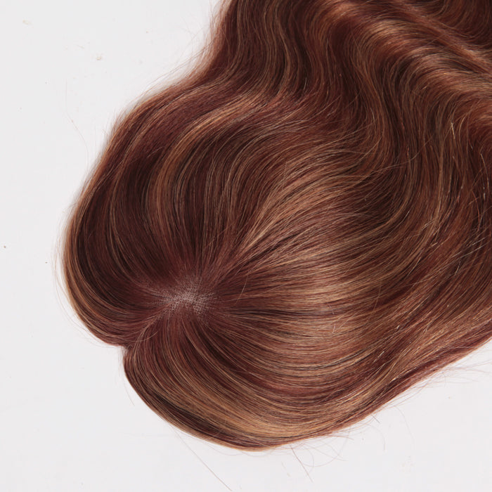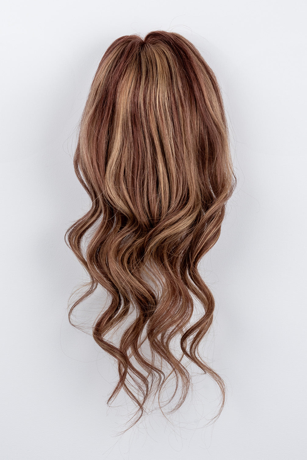 The Nicole Full Volume Hair Topper is a striking spicy warm medium red shade with golden blonde highlights and a warm red 1-inch root base, offering a vibrant and bold color option. This 100% hand-tied: European human hair topper is ideal for those looking to enhance their natural auburn hues or add a rich, fiery dimension to their hair. The hand-tied design ensures a seamless, natural blend, while the 100% Remy human hair topper provides versatility, softness, and long-lasting durability. Available in 5-6” and 12-18” lengths, the Nicole clip-in hair topper offers beautiful movement, volume, and full coverage.