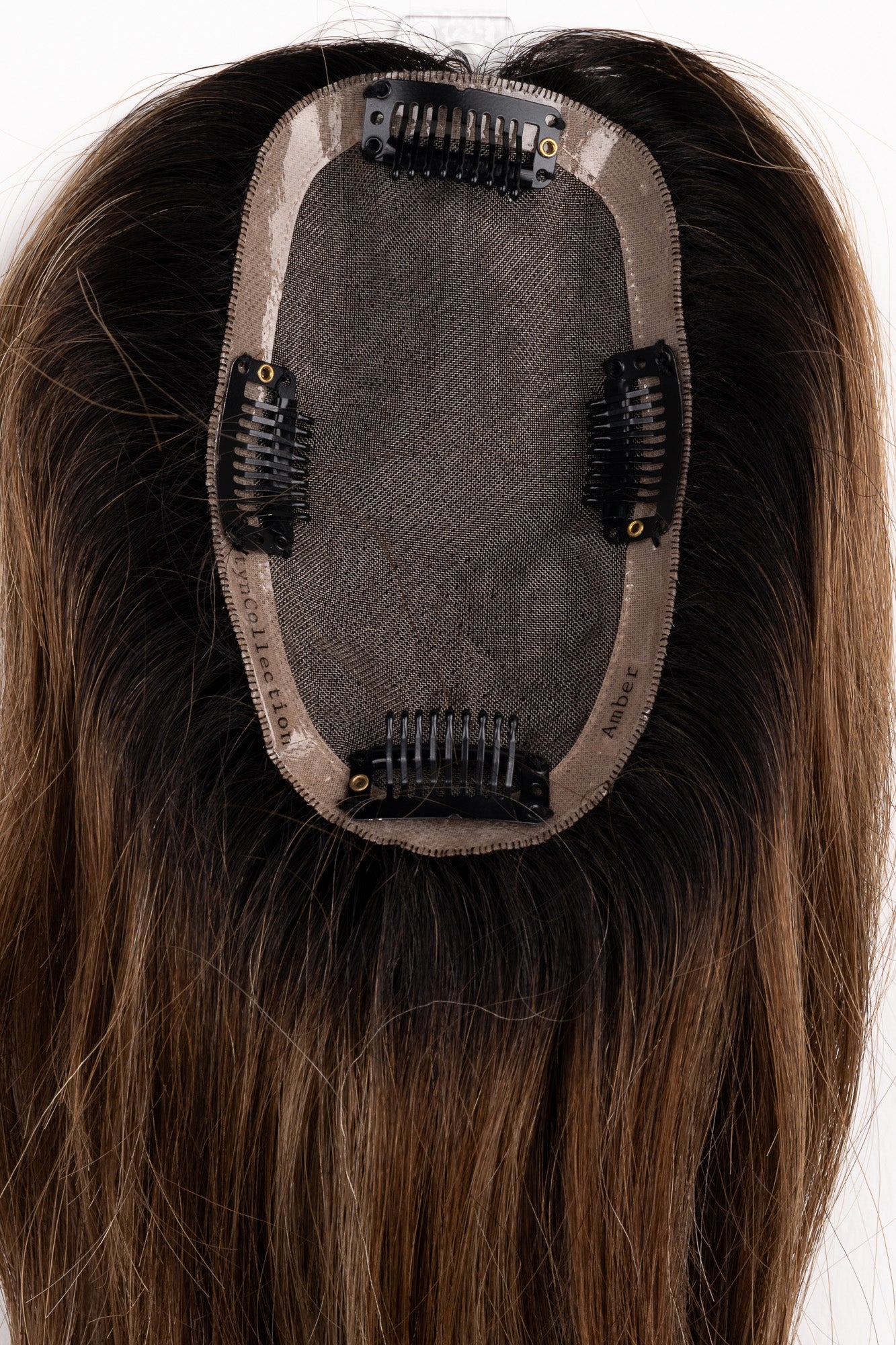 ***THIS IS A FINAL SALE PIECE: THIS CUSTOM COLOR PIECE CANNOT BE RETURNED OR EXCHANGED! Introducing this stunning custom colored topper "Sepia Radiance". This is the only one of its kind, so act fast if you want your hands (or head) on it! This extension is great for women with medium to long hair that just want to add a little extra volume or cover those unwanted grays. It has a 3’’ by 5’’ base which clips in right around your roots.