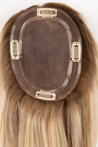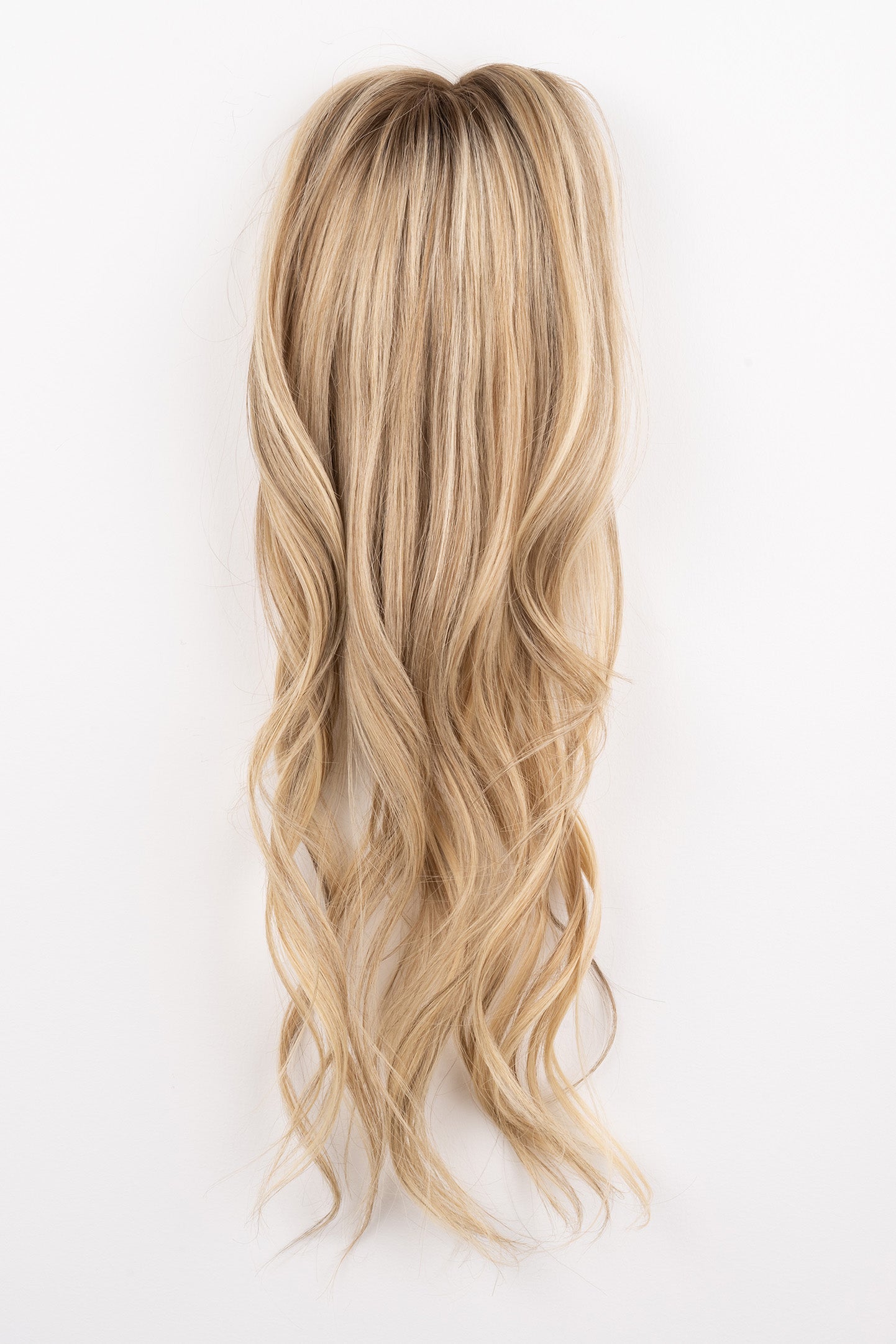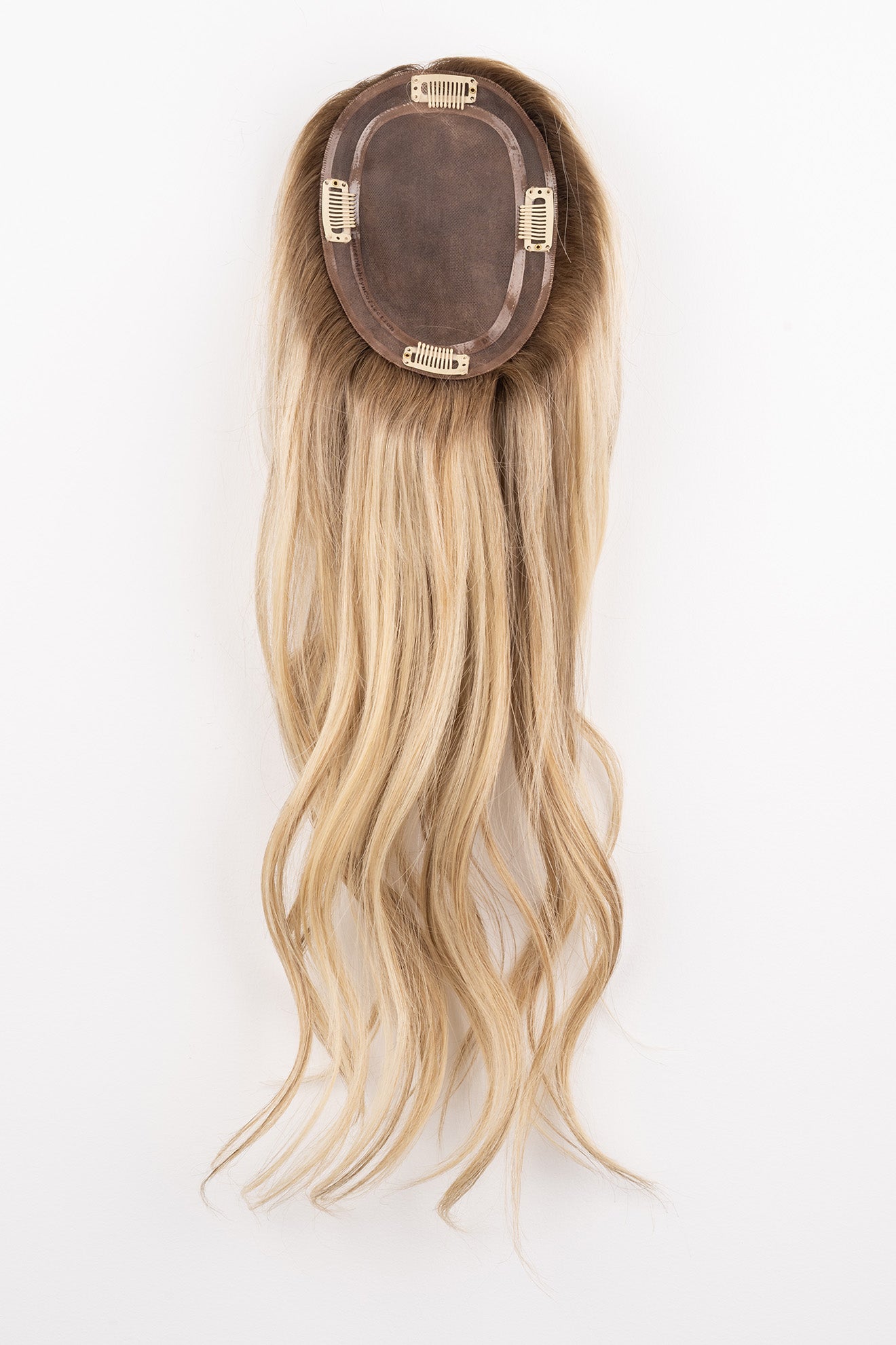 ***THIS IS A FINAL SALE PIECE: THIS CUSTOM COLOR PIECE CANNOT BE RETURNED OR EXCHANGED! Introducing this stunning custom colored topper "Soft Breeze". This is the only one of its kind, so act fast if you want your hands (or head) on it! The 12-18” full volume extension is the flagship piece in our collection and was first designed by our founder, Lauren Ashtyn, to be her own personal hairpiece. Long, thick, and luxurious, the full volume extension is 18 inches in length with 12” layers. The micro-mesh base is approximately 5”x 6”, which gives this hairpiece twice the density of the 12-16” light volume topper. This hairpiece is worn for maximum volume, length, and fullness. It is sufficiently large enough to cover any thinning spots on the sides and top of the head, as well as the crown and back of the head.