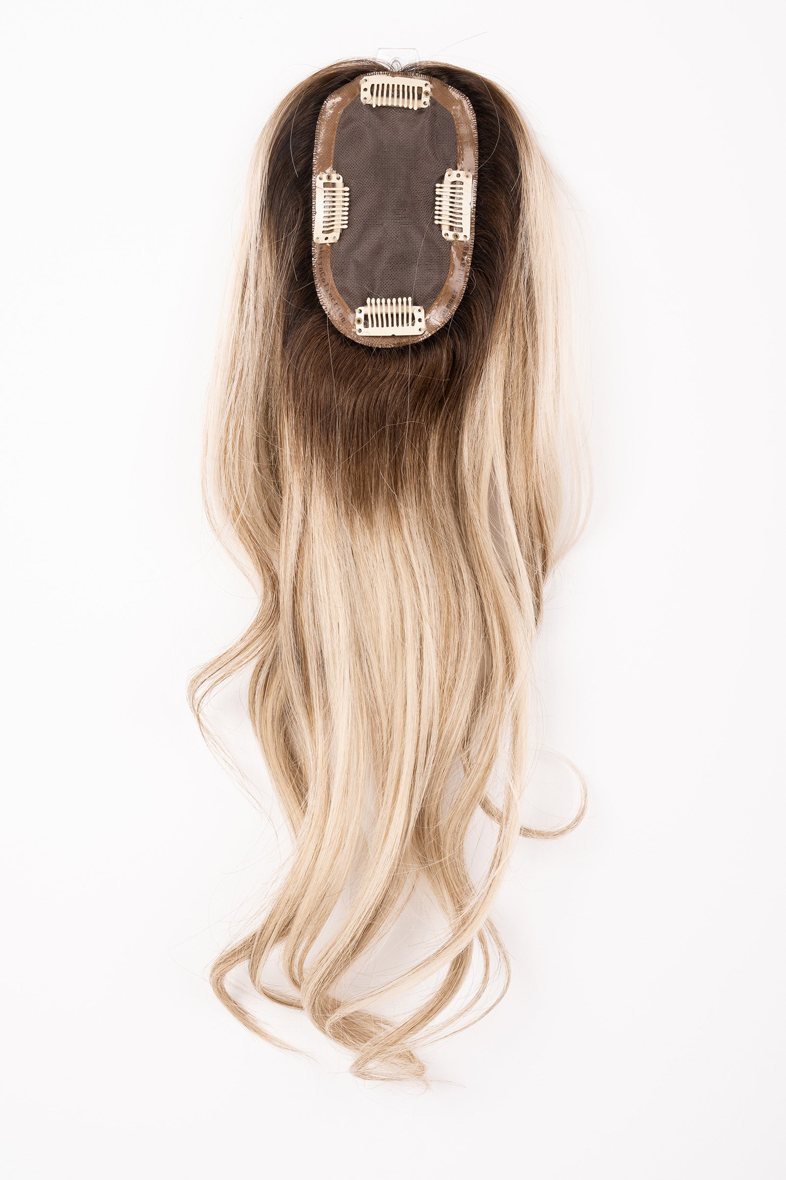 ***THIS IS A FINAL SALE PIECE: THIS CUSTOM COLOR PIECE CANNOT BE RETURNED OR EXCHANGED! Introducing this stunning custom colored topper "Sunlit Champagne". This is the only one of its kind, so act fast if you want your hands (or head) on it! This extension is great for women with medium to long hair that just want to add a little extra volume or cover those unwanted grays. It has a 3’’ by 5’’ base which clips in right around your roots.