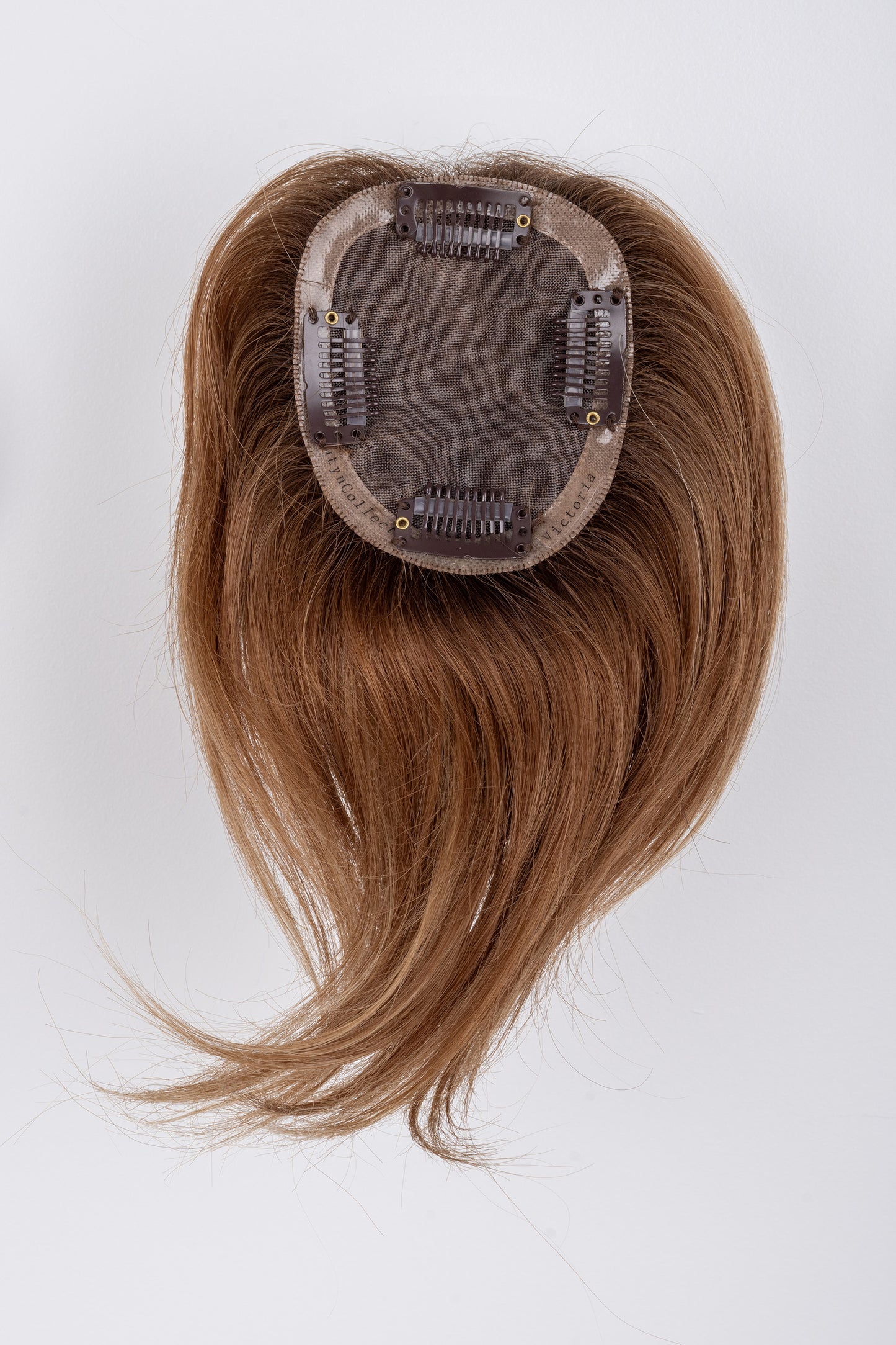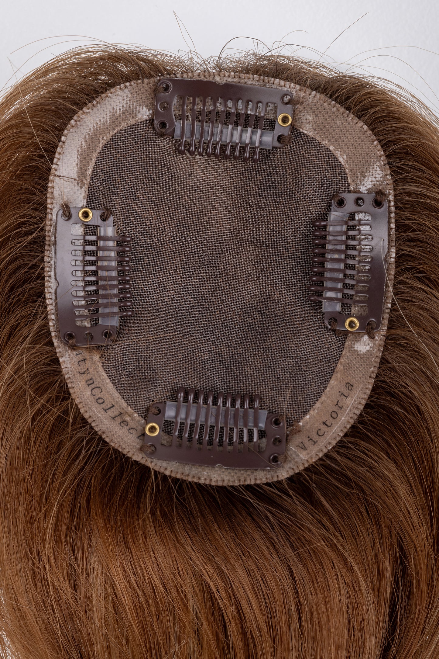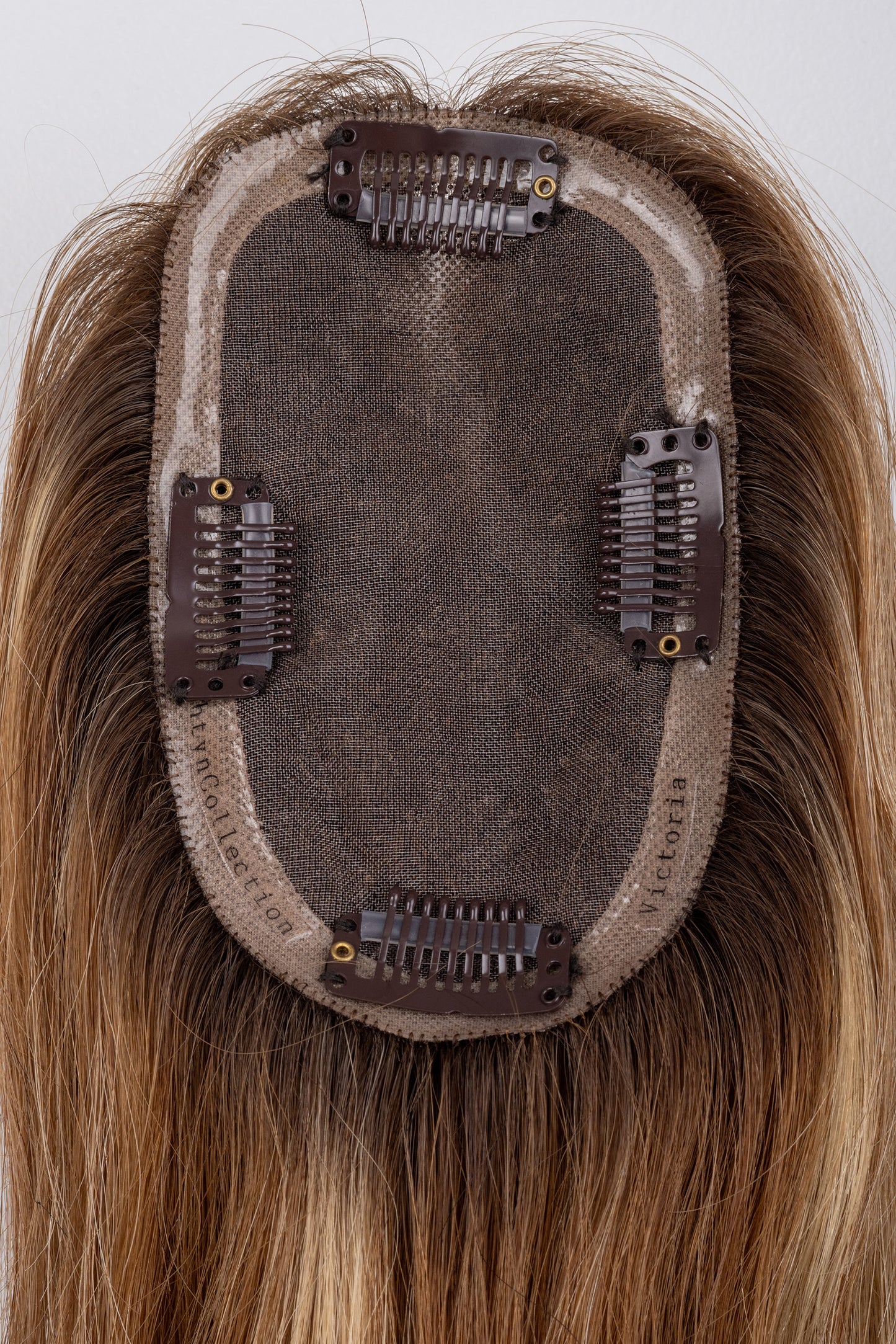 The Victoria Light Volume Hair Topper features a warm medium brown root with bold golden highlights and a medium brown base, creating a beautifully blended and radiant appearance. This 100% hand-tied: European human hair topper provides a natural, lightweight feel while ensuring seamless integration with existing hair. The 100% Remy human hair topper is soft, easy to style, and offers long-lasting quality, making it a perfect choice for those looking for added volume and brightness. Available in 5-6” and 12-16” lengths, the Victoria clip-in hair topper enhances depth, warmth, and natural movement.