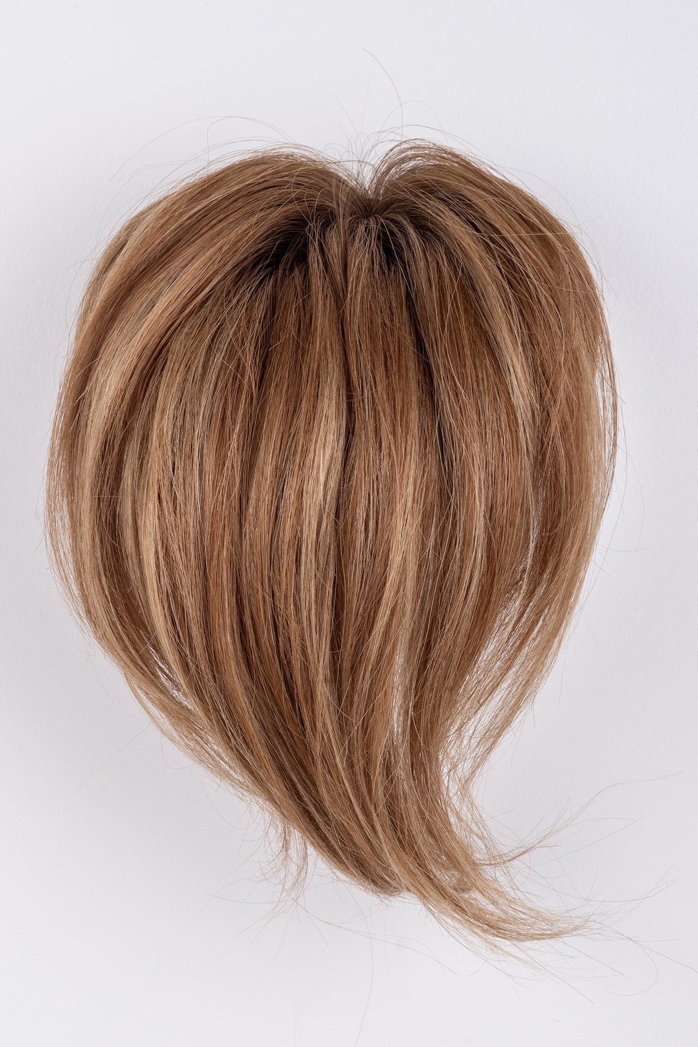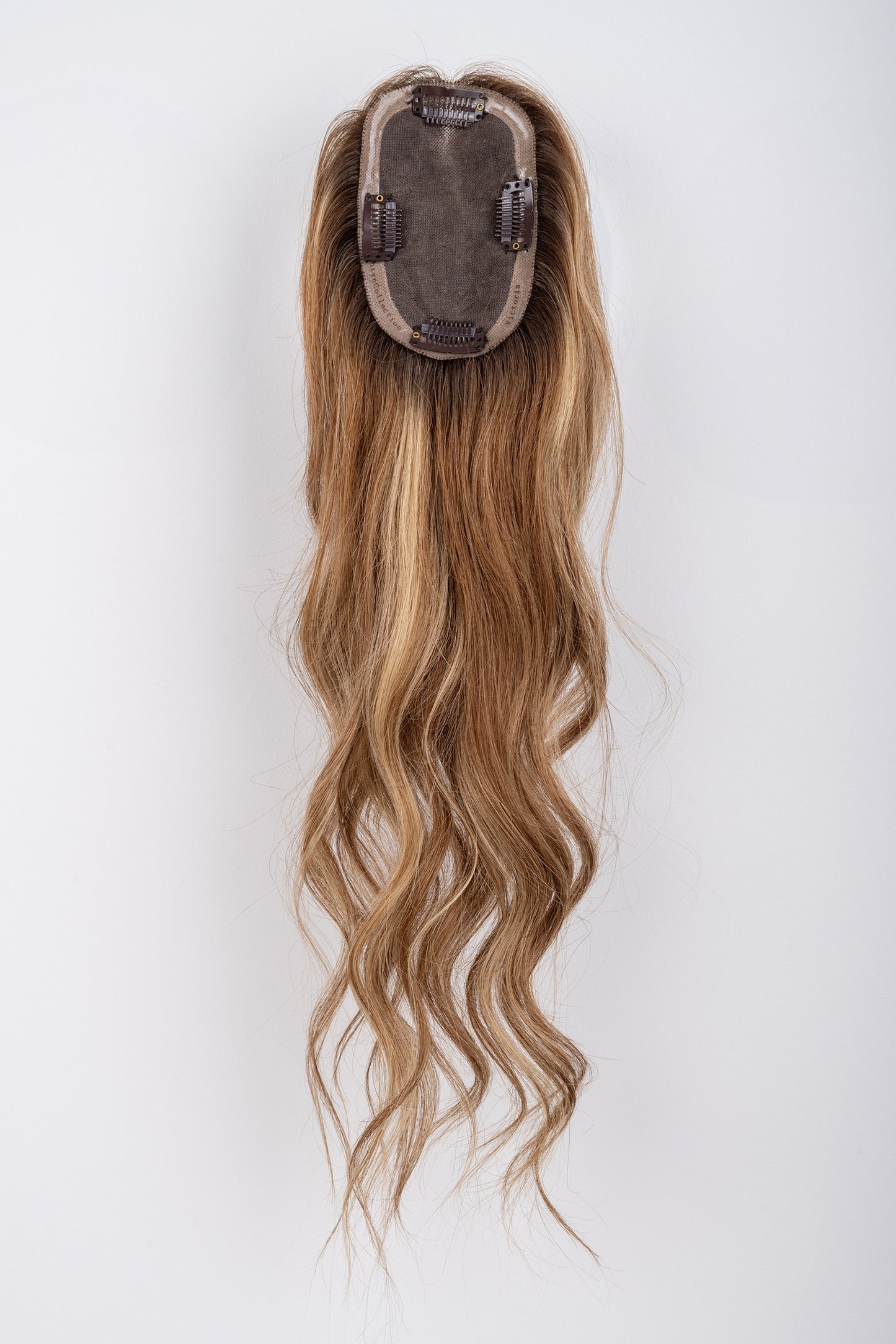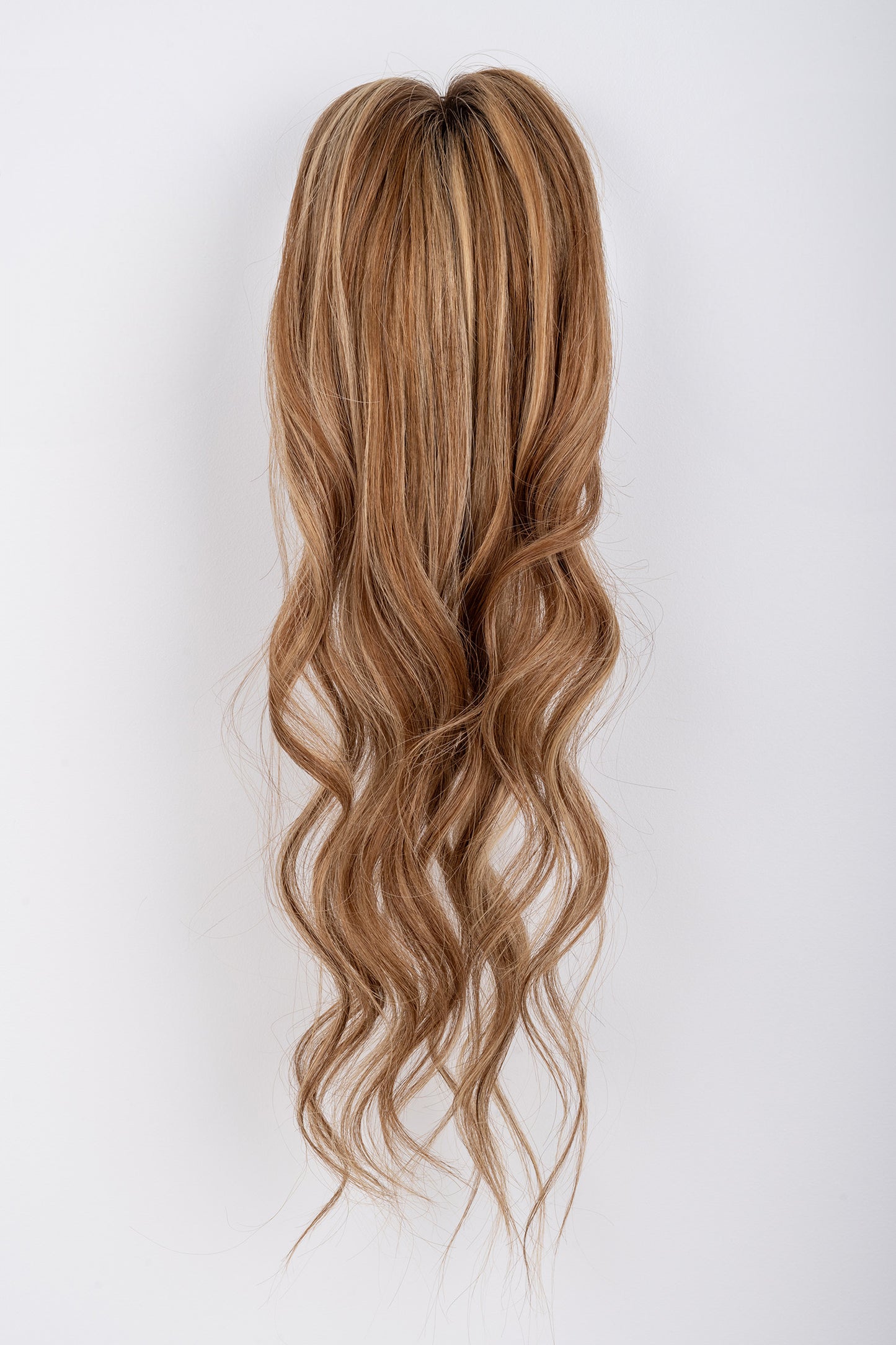 The Victoria Light Volume Hair Topper features a warm medium brown root with bold golden highlights and a medium brown base, creating a beautifully blended and radiant appearance. This 100% hand-tied: European human hair topper provides a natural, lightweight feel while ensuring seamless integration with existing hair. The 100% Remy human hair topper is soft, easy to style, and offers long-lasting quality, making it a perfect choice for those looking for added volume and brightness. Available in 5-6” and 12-16” lengths, the Victoria clip-in hair topper enhances depth, warmth, and natural movement.