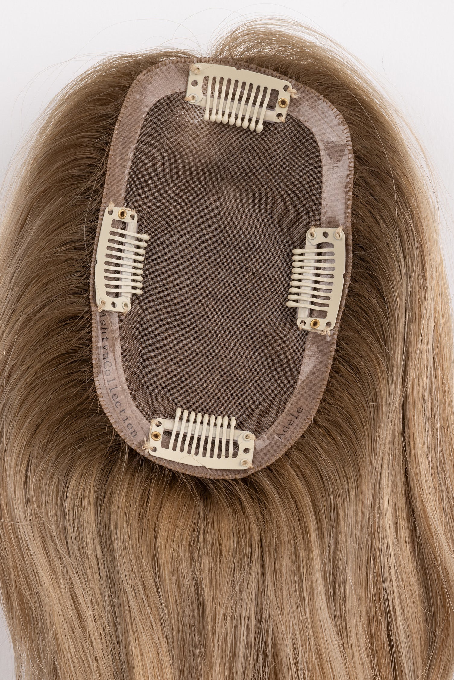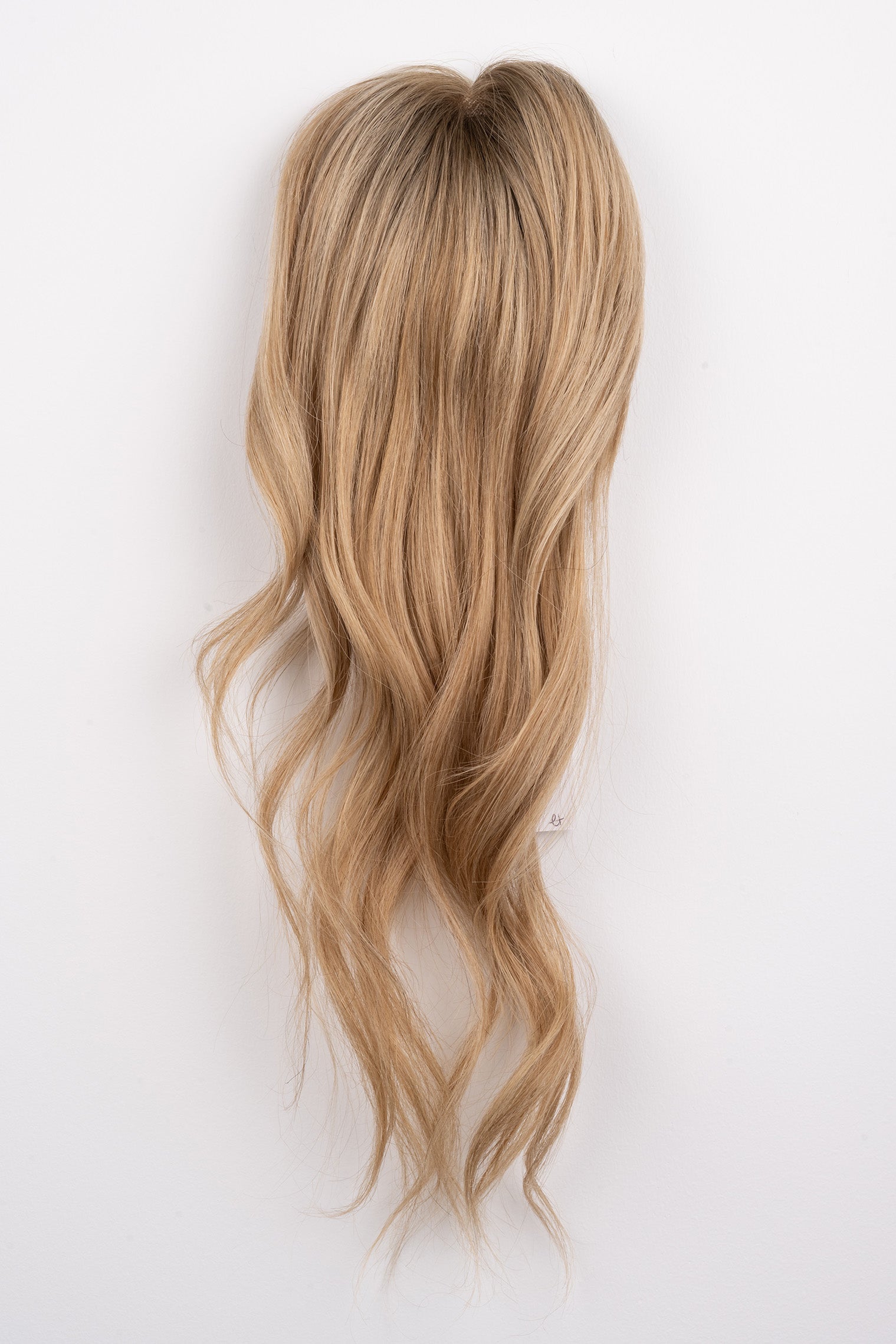 ***THIS IS A FINAL SALE PIECE: THIS CUSTOM COLOR PIECE CANNOT BE RETURNED OR EXCHANGED! Introducing this stunning custom colored topper "Whisper Gold". This is the only one of its kind, so act fast if you want your hands (or head) on it! This extension is great for women with medium to long hair that just want to add a little extra volume or cover those unwanted grays. It has a 3’’ by 5’’ base which clips in right around your roots.